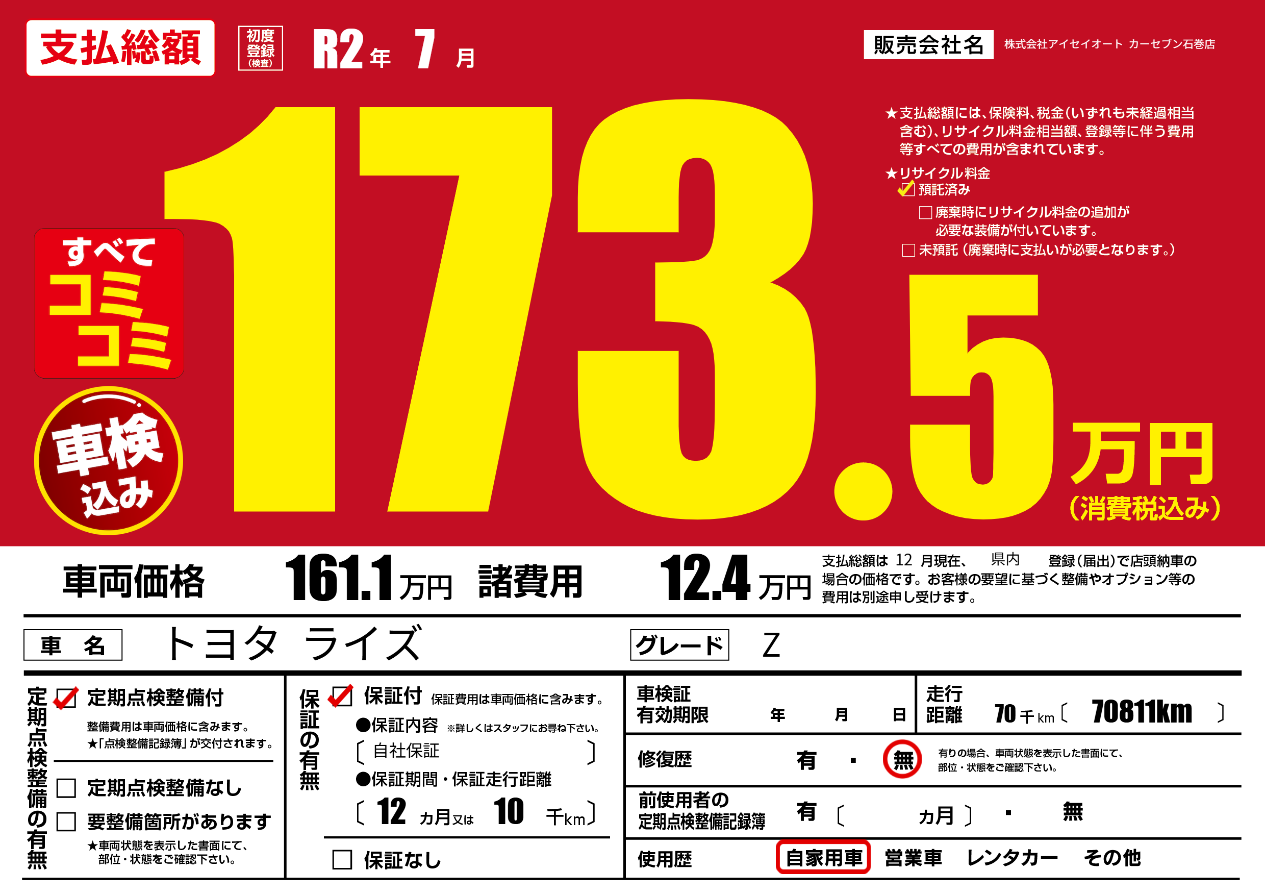 | 走行キロ | 7万km | 初年度登録 | R2年7月 |