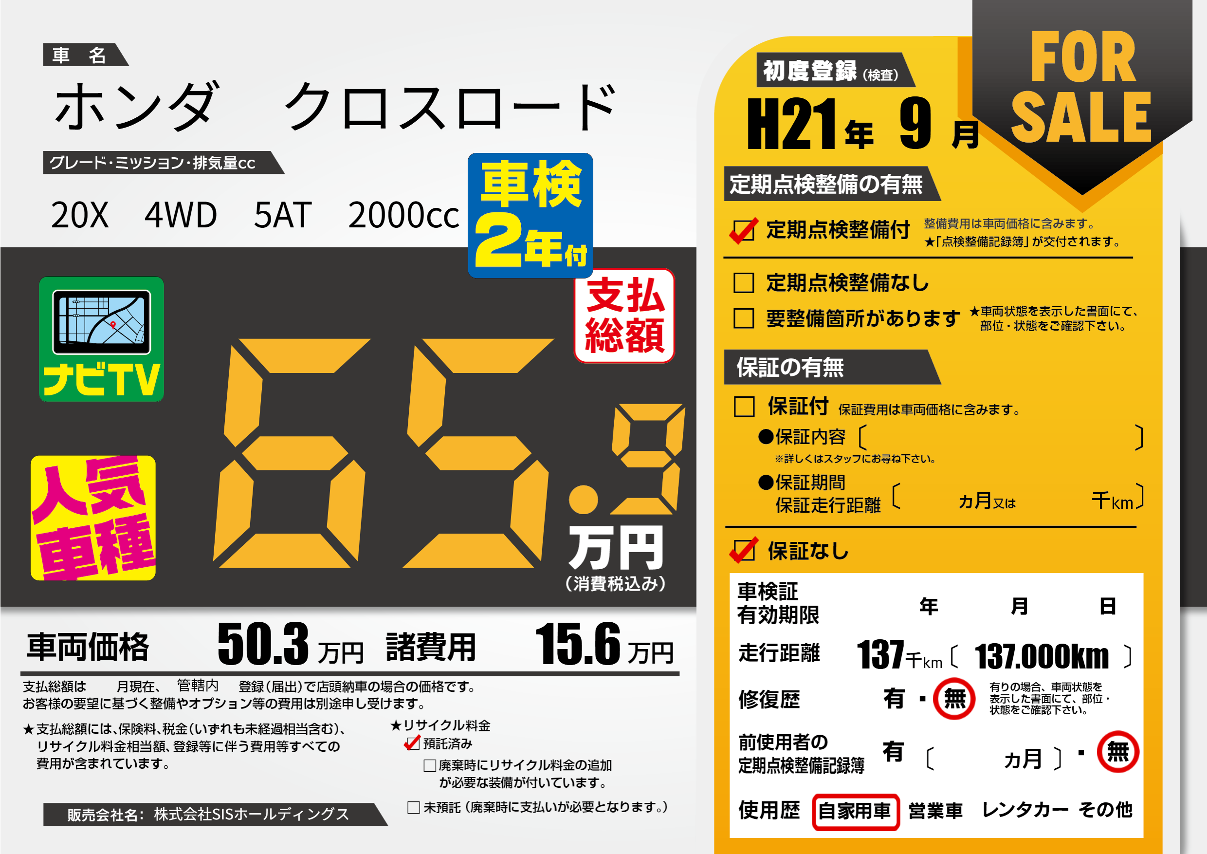 | 走行キロ | 13.7万km | 初年度登録 | H21年9月 |