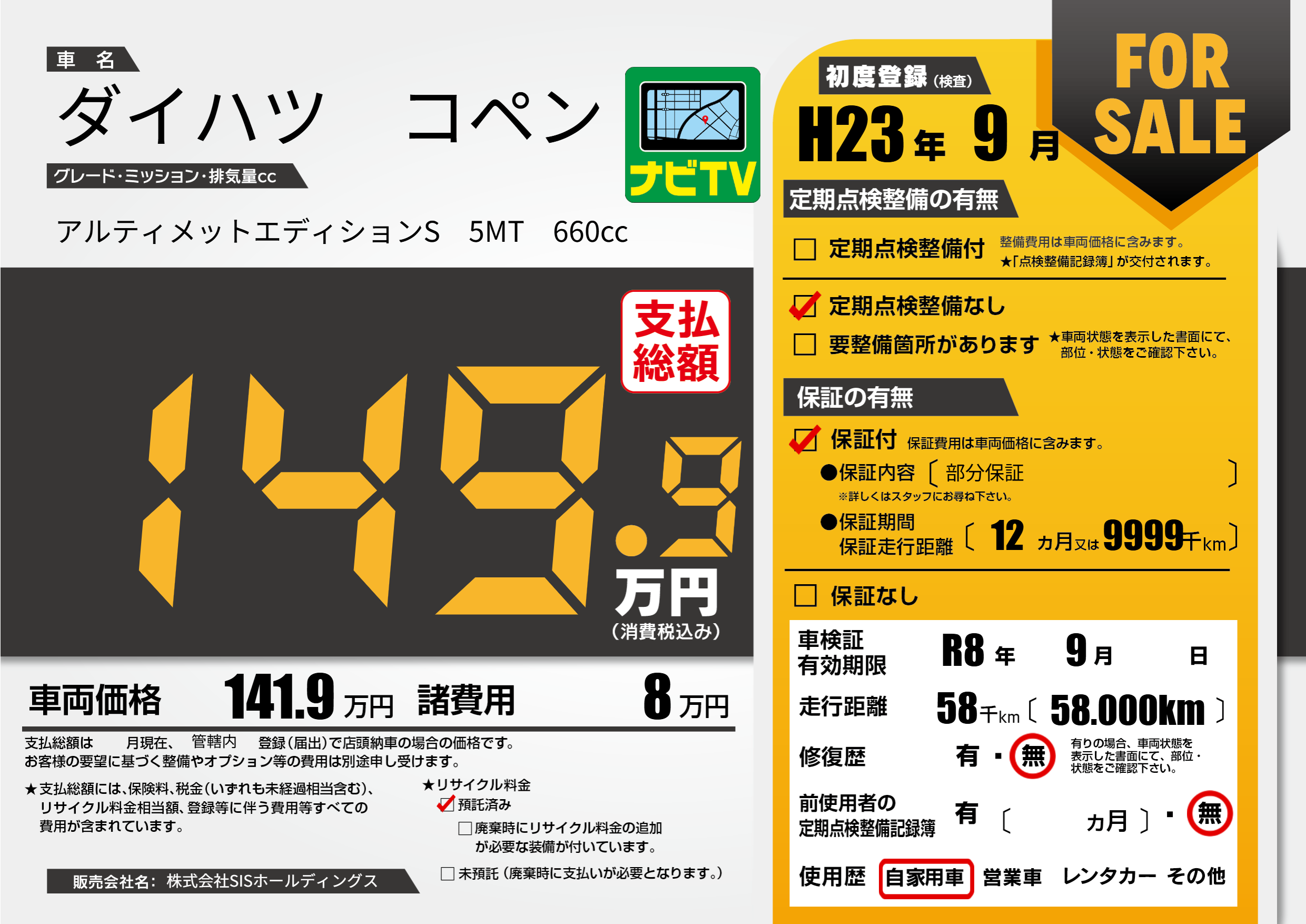 | 車名 | ダイハツ コペン | グレード ミッション 排気量 |
