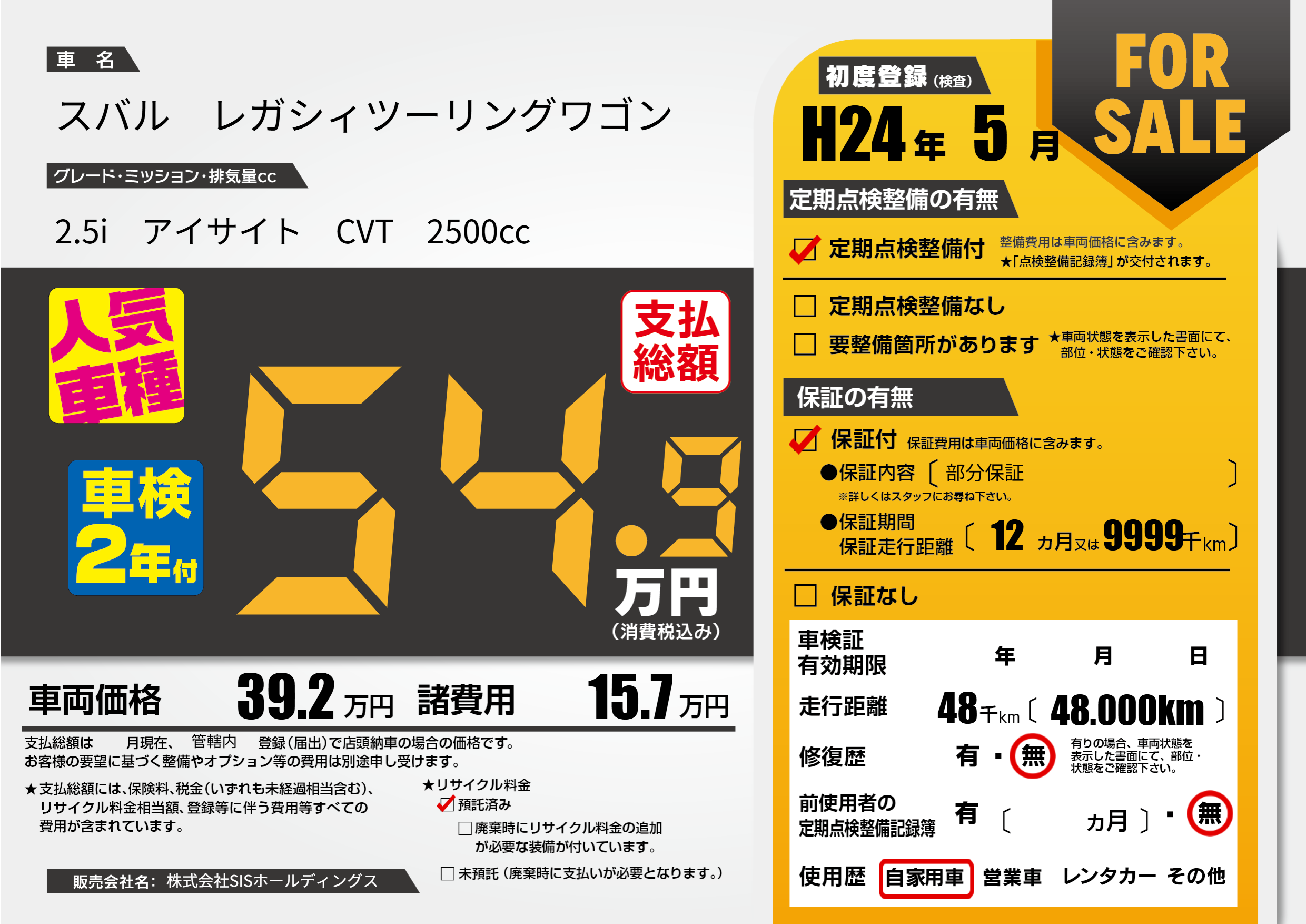 | 走行キロ | 4.8万km | 初年度登録 | H24年5月 |