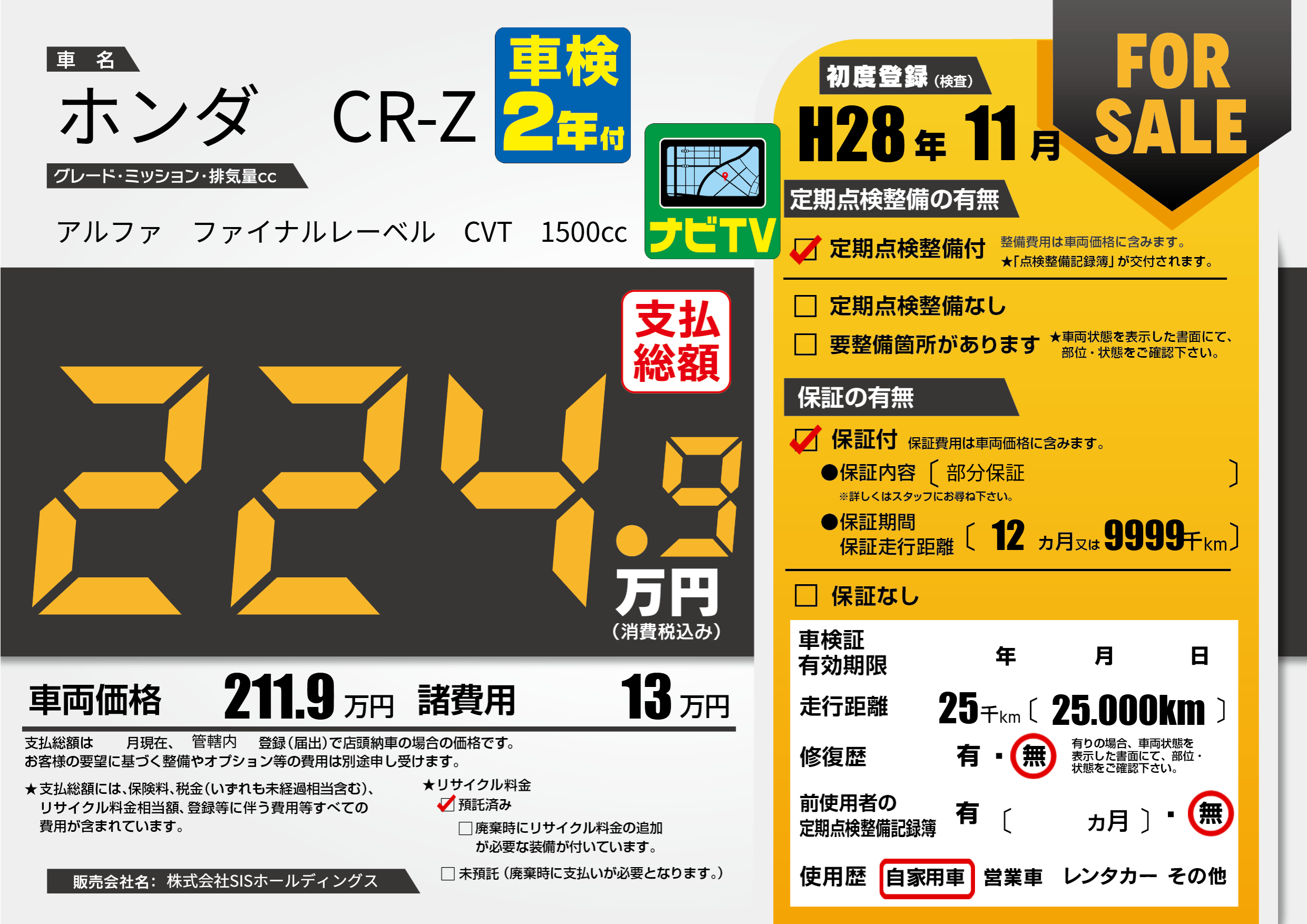 保証付き 保証内容(部分保証) 12ヶ月または(9999)千kmまで |