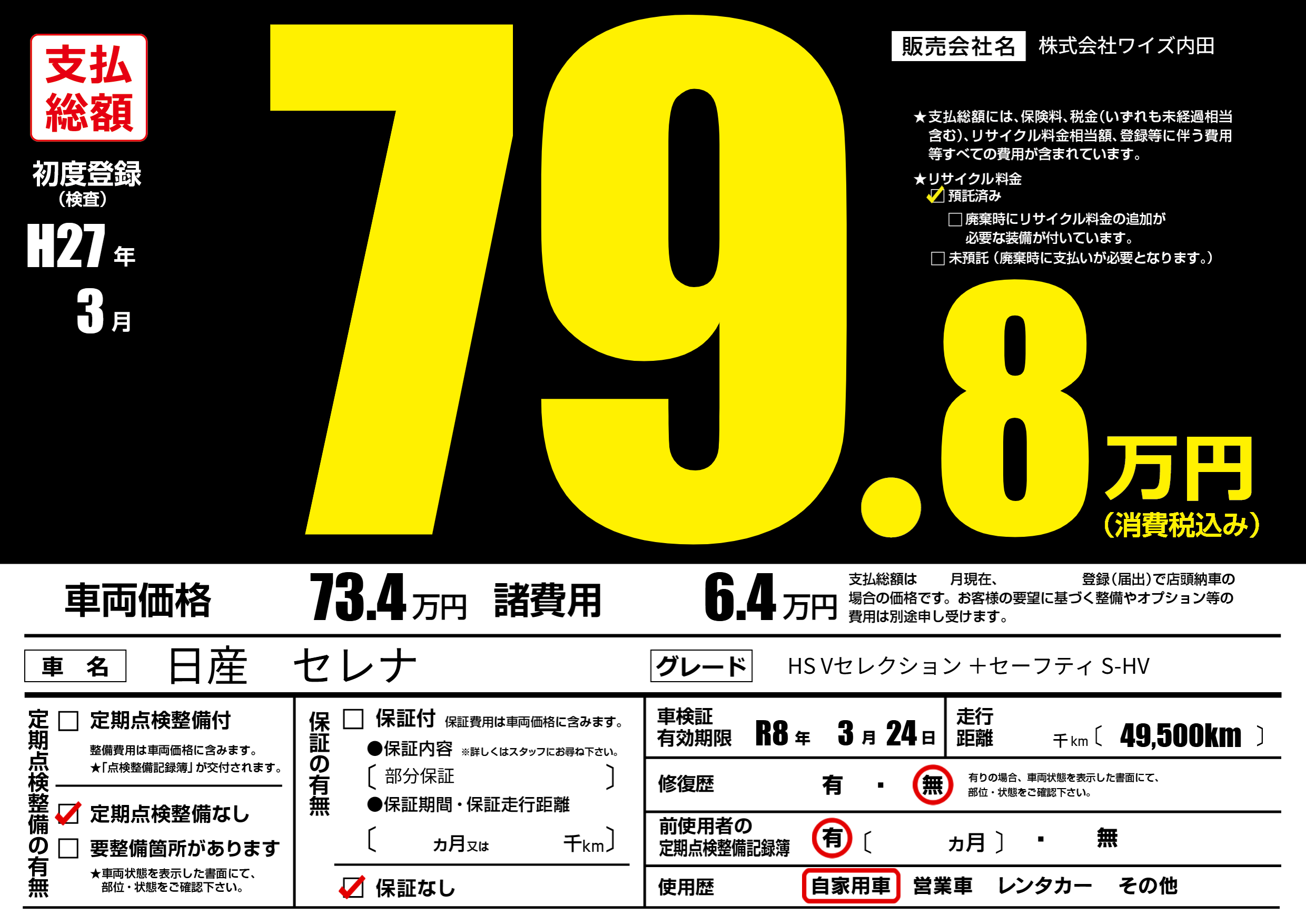 | 走行キロ | - | 初年度登録 | H27年3月 |