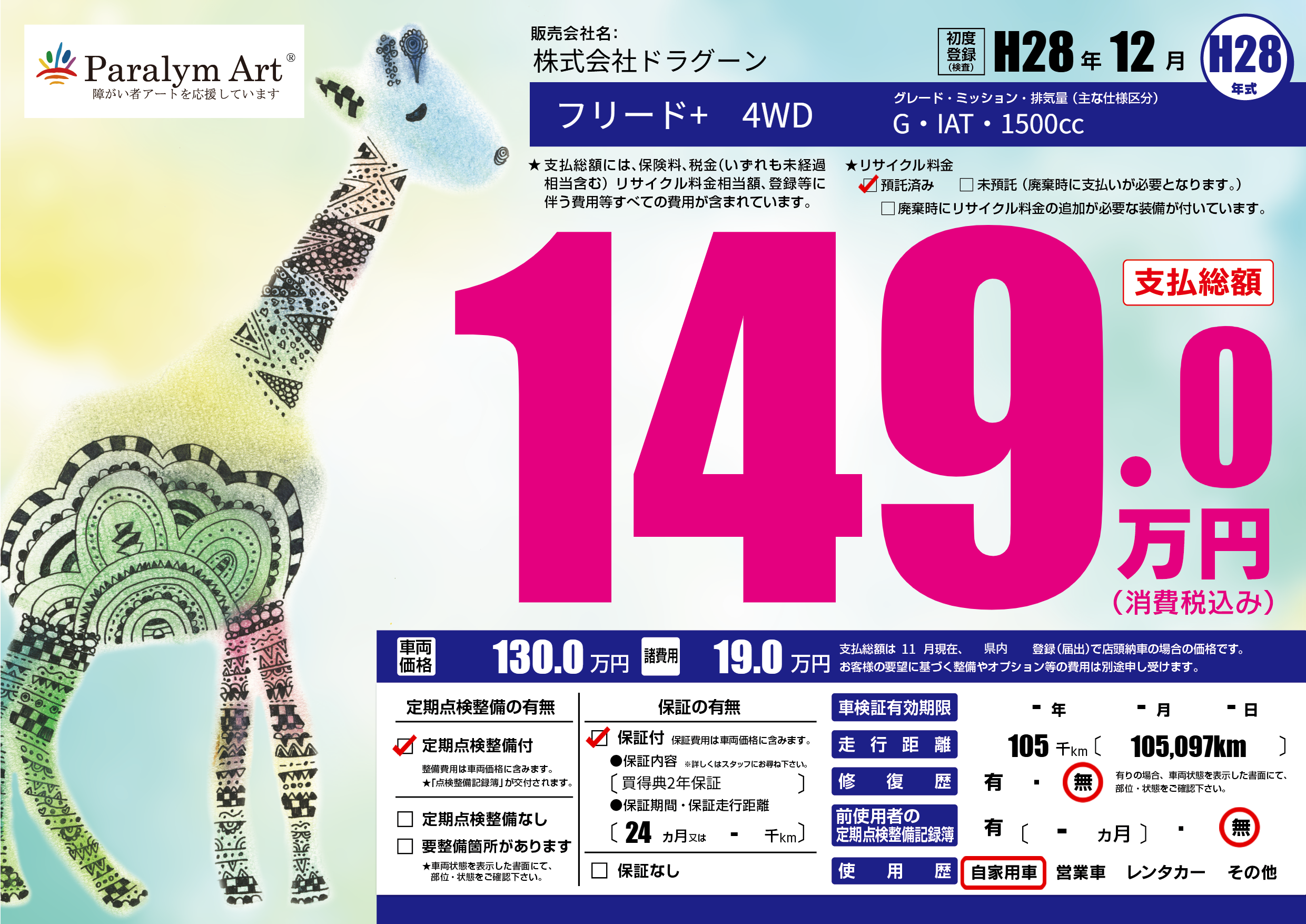 | 走行キロ | 10.5万km | 初年度登録 | H28年12月 |