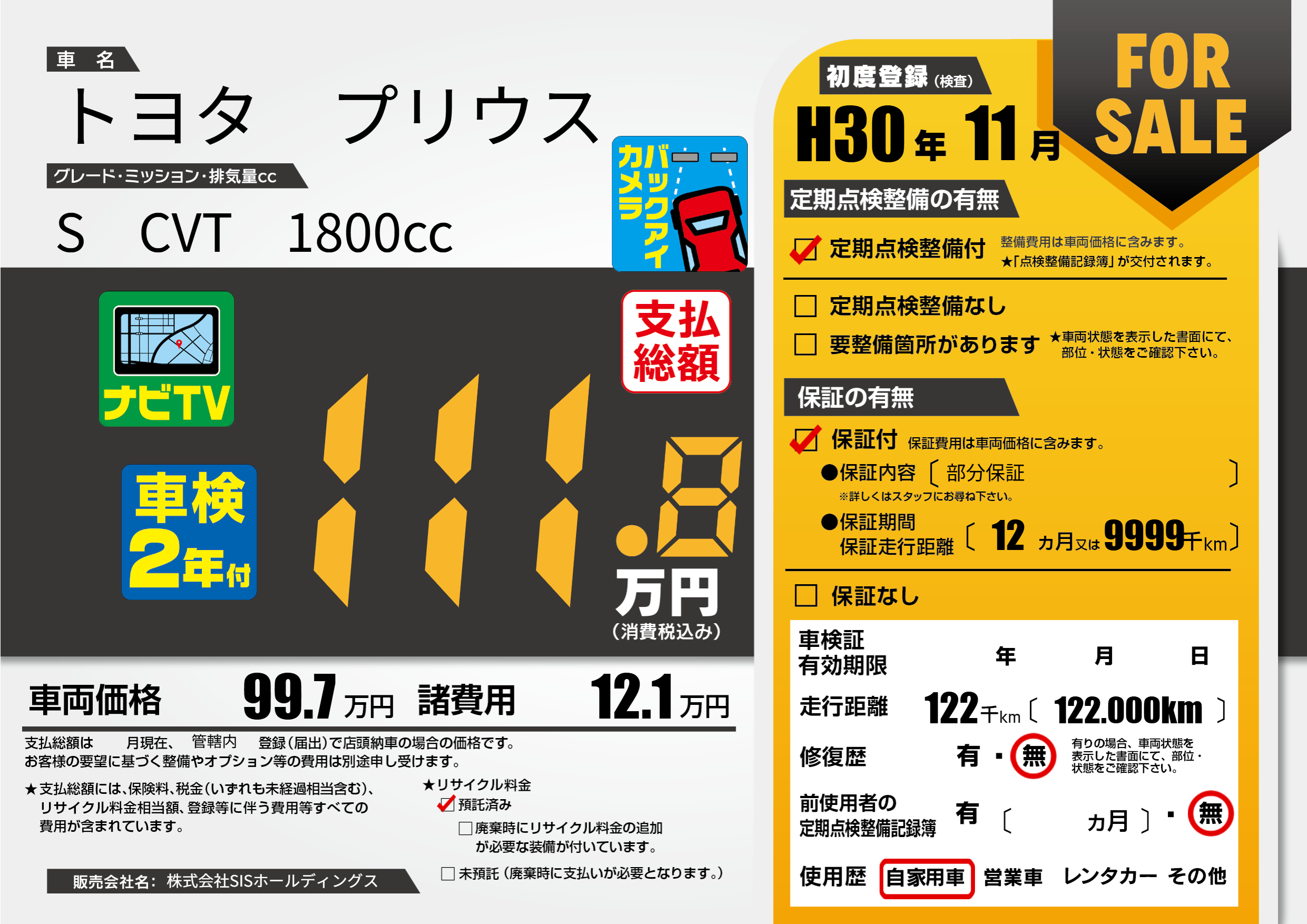 保証付き 保証内容(部分保証) 12ヶ月または(9999)千kmまで |