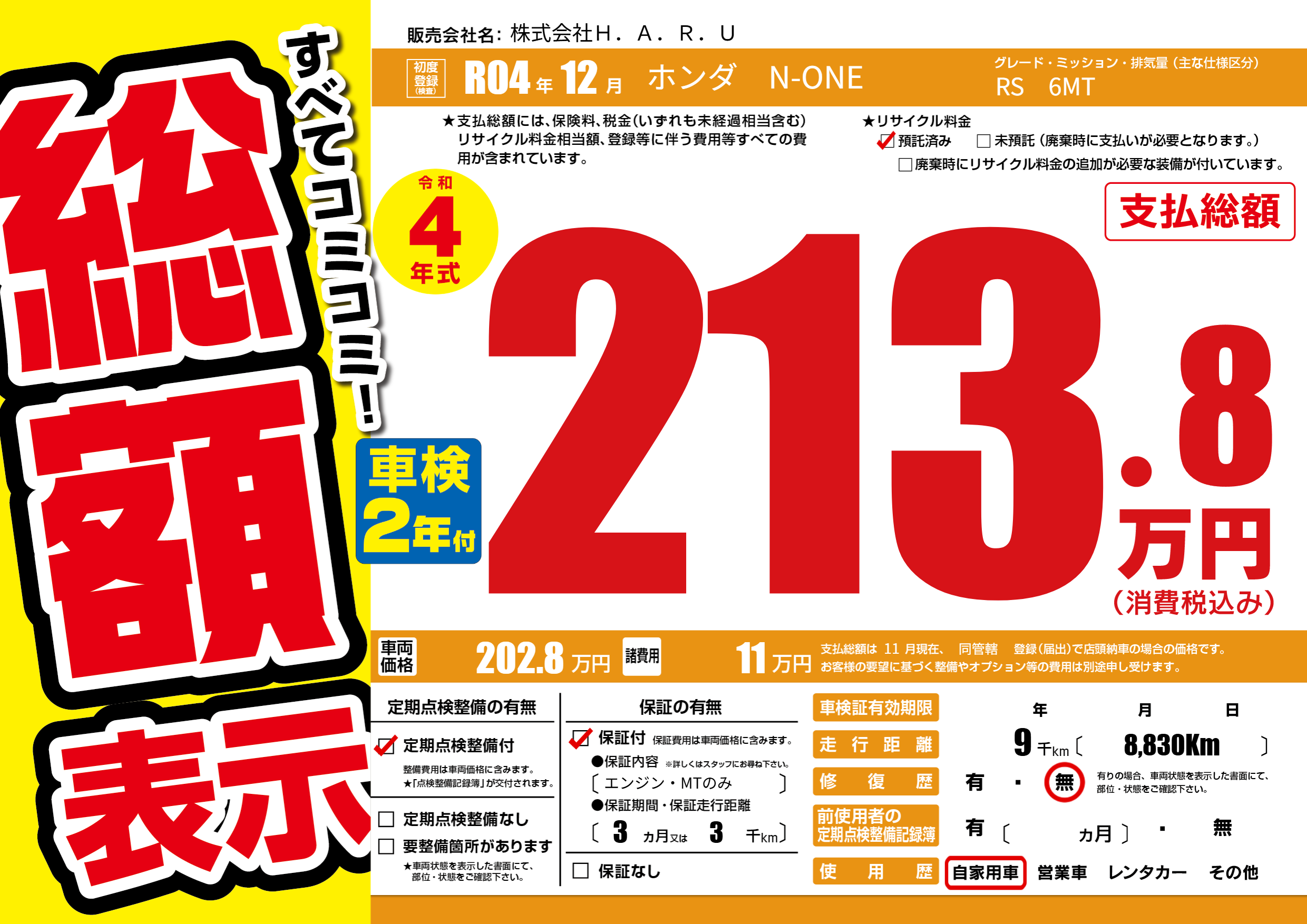 | 走行キロ | 0.9万km | 初年度登録 | R04年12月 |