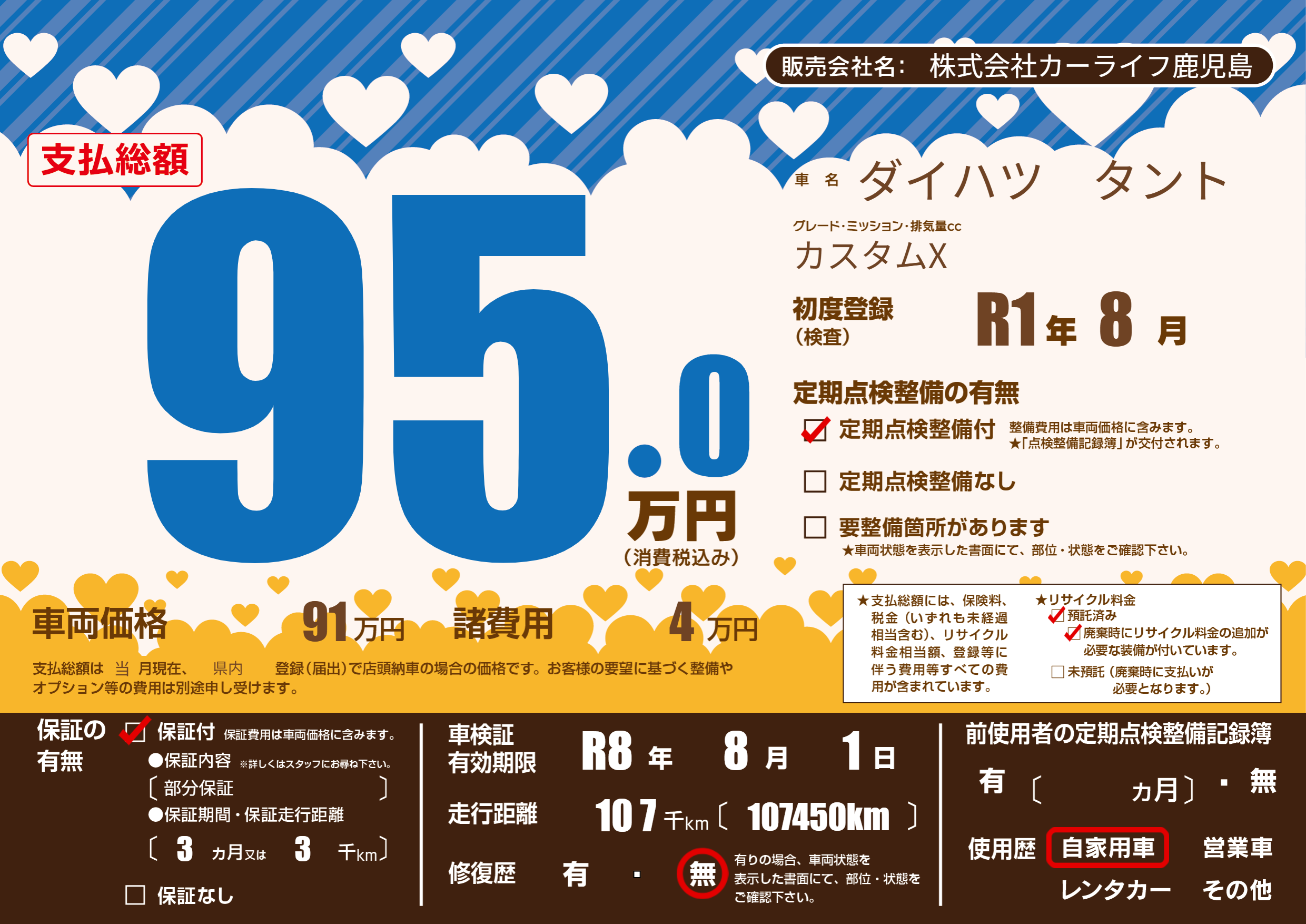 | 車名 | ダイハツ タント | グレード ミッション 排気量 |