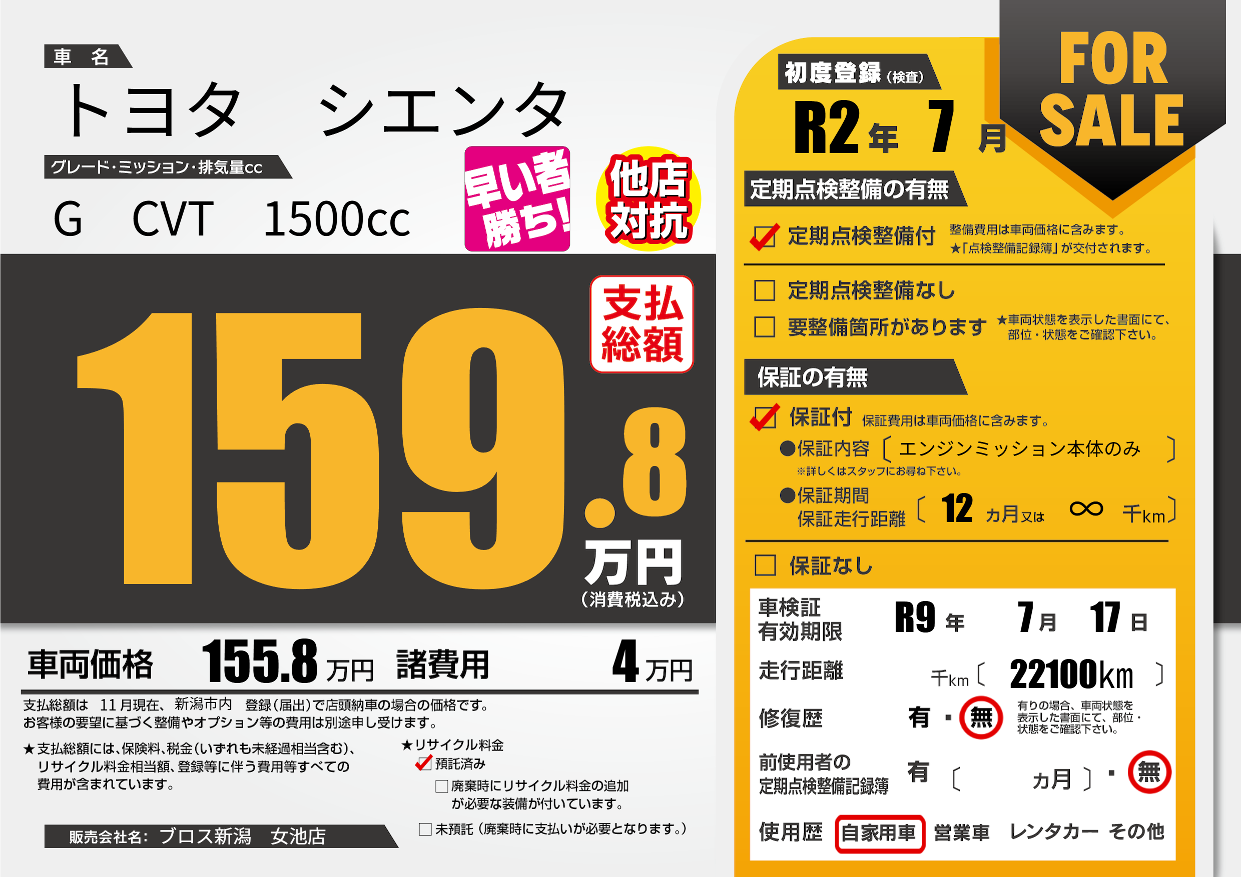 | 車名 | トヨタ シエンタ | グレード ミッション 排気量 |