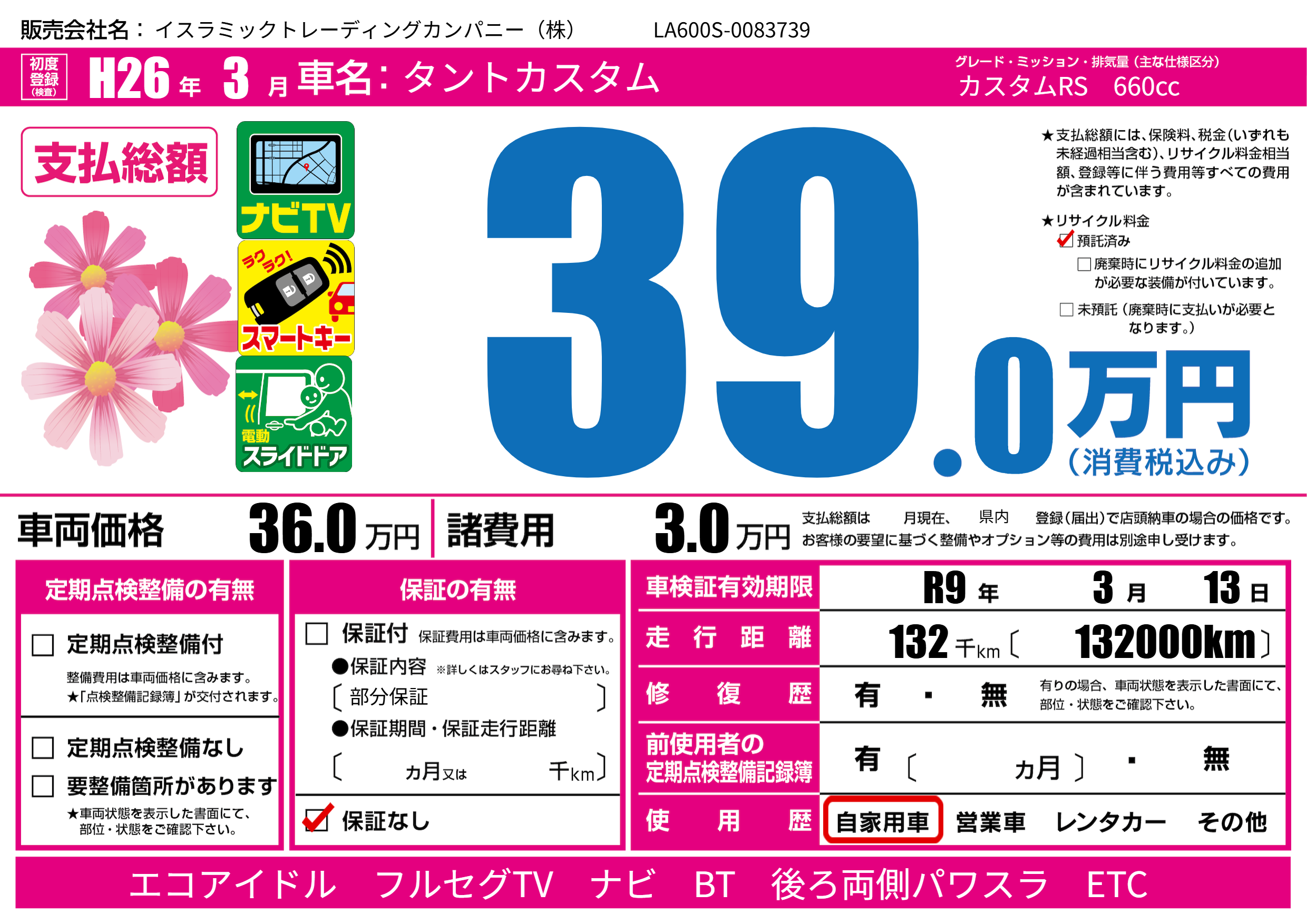 | 走行キロ | 13.2万km | 初年度登録 | H26年3月 |
