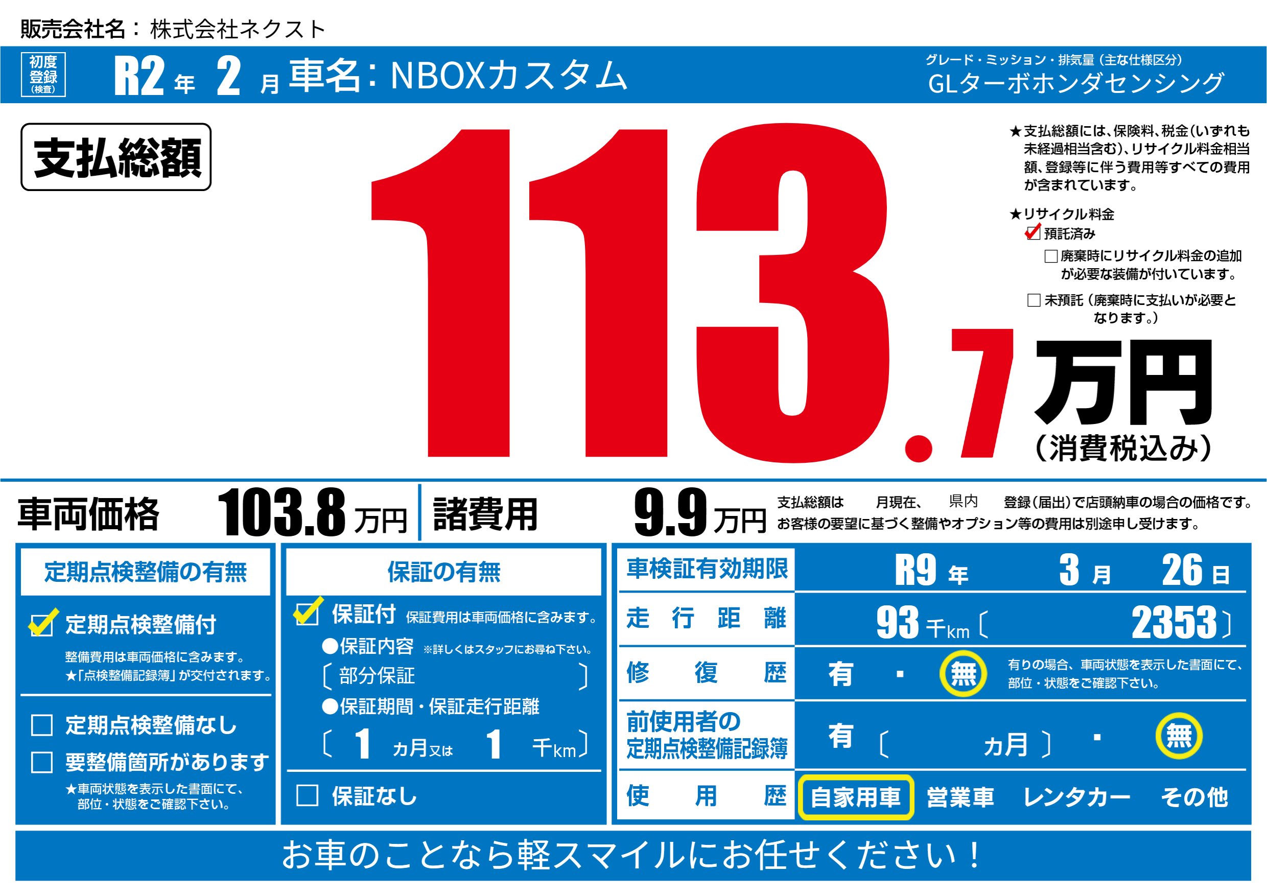 なし | 車検制限 | R9年3月26月 |