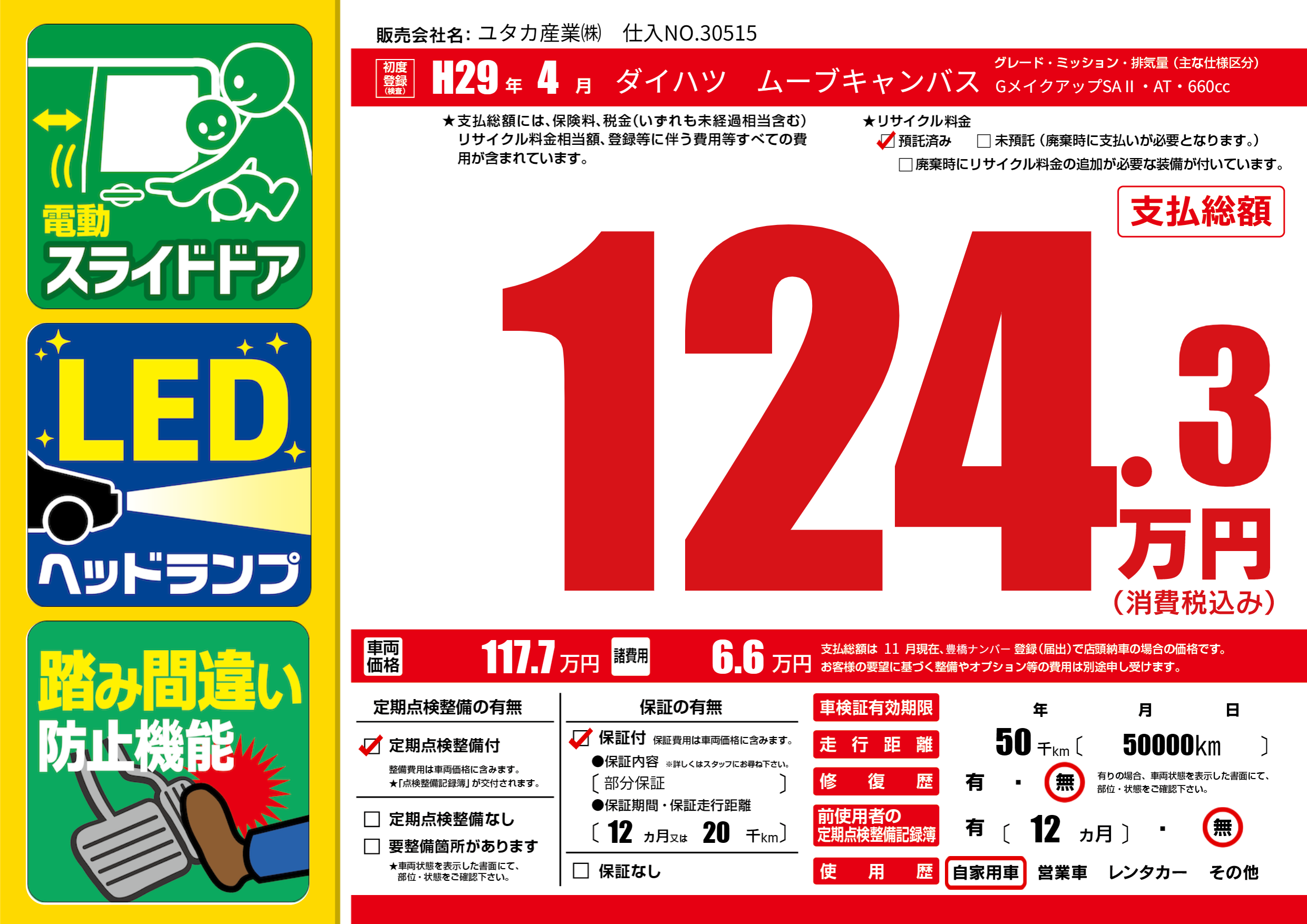 | 走行キロ | 5万km | 初年度登録 | H29年4月 |