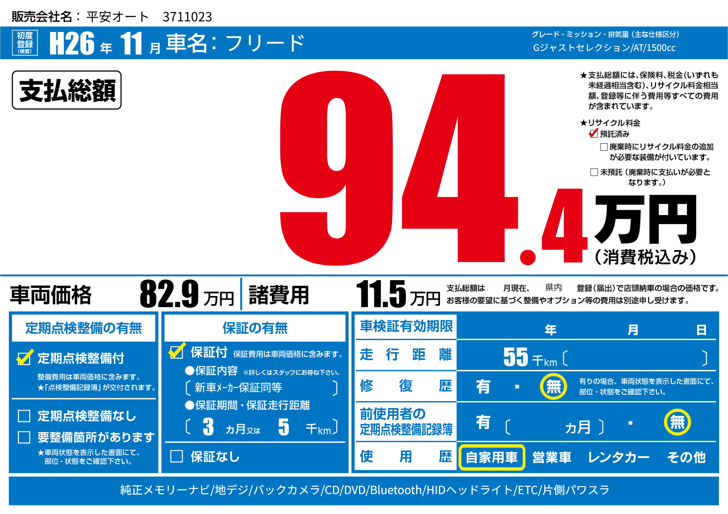 | 走行キロ | 5.5万km | 初年度登録 | H26年11月 |