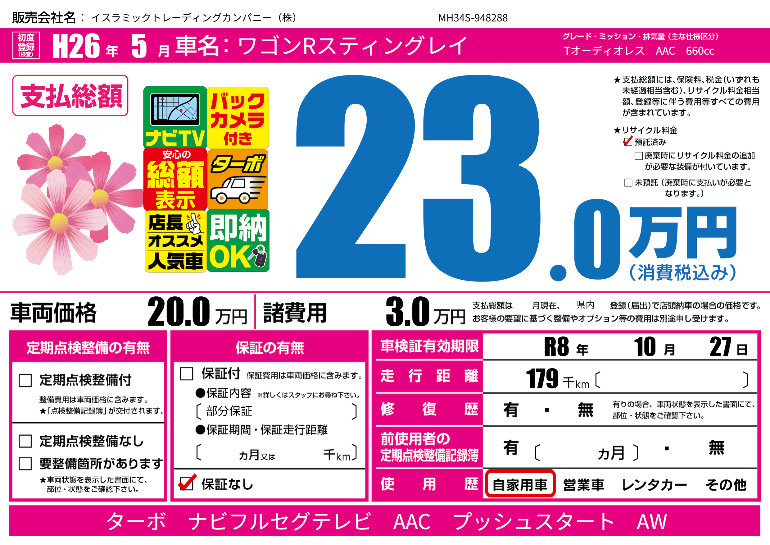 | 走行キロ | 17.9万km | 初年度登録 | H26年5月 |