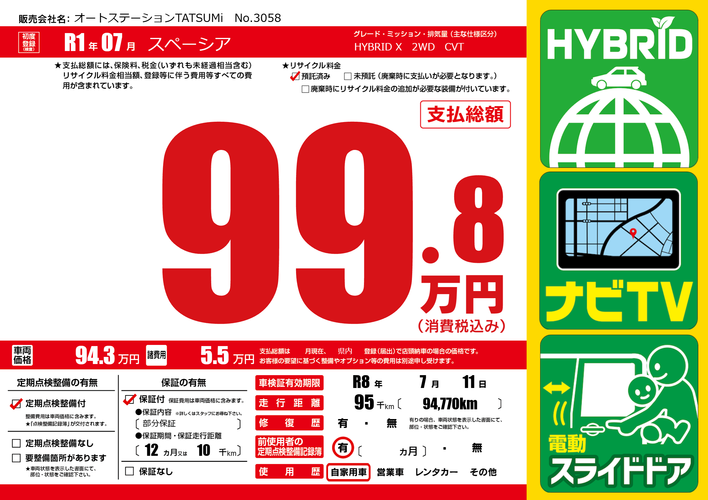 | 車名 | スペーシア | グレード ミッション 排気量 |
