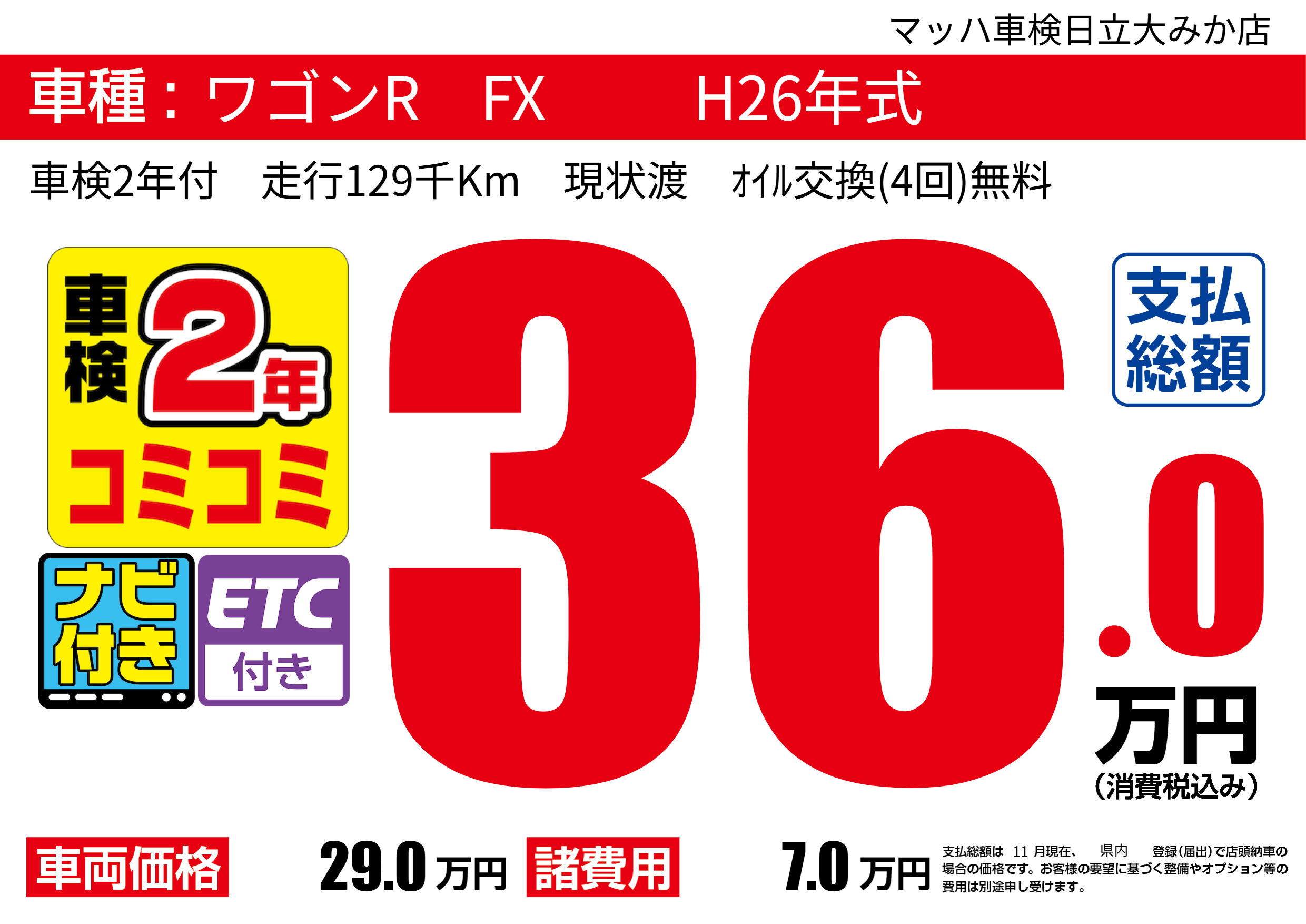 車検2年付 走行129千Km 現状渡 オイル交換(4回)無料 |