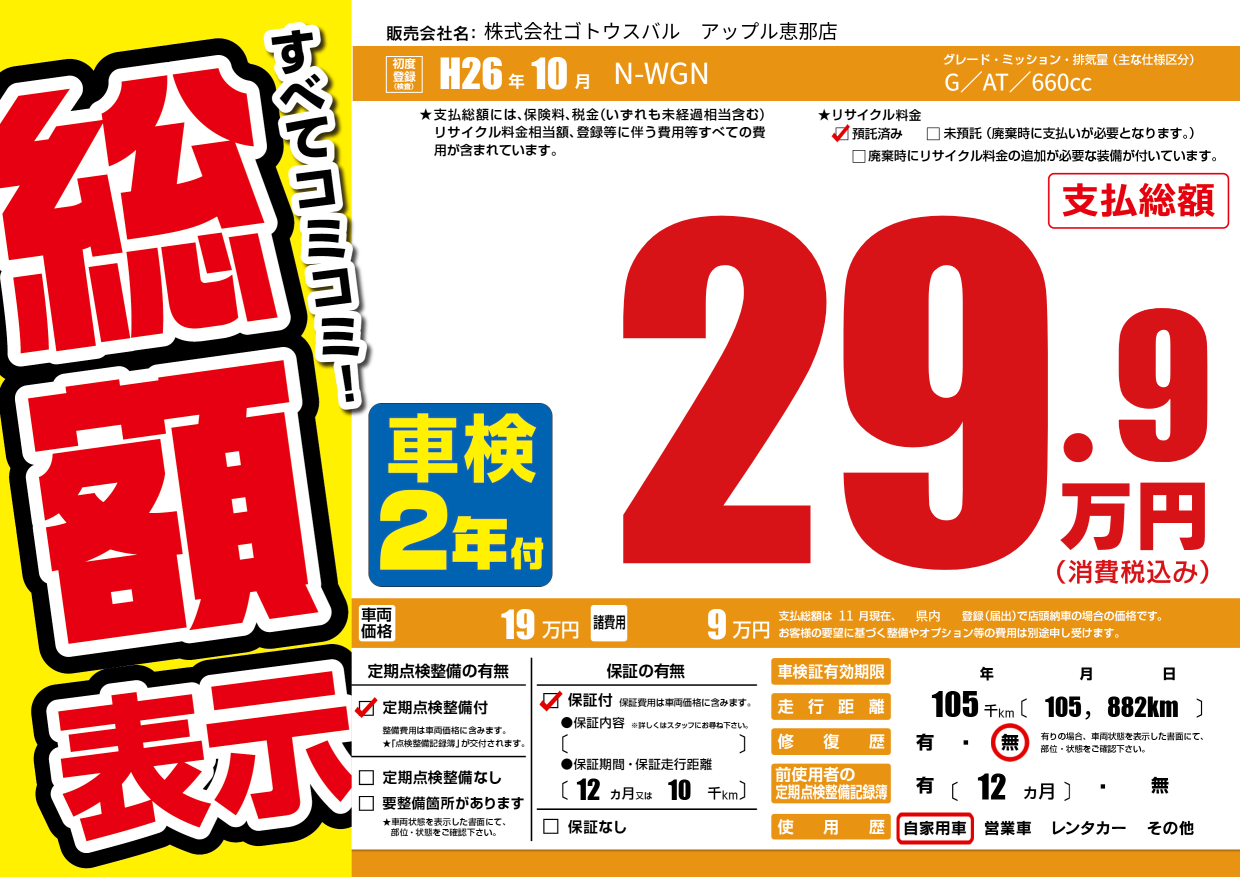 | 車名 | N-WGN | グレード ミッション 排気量 |