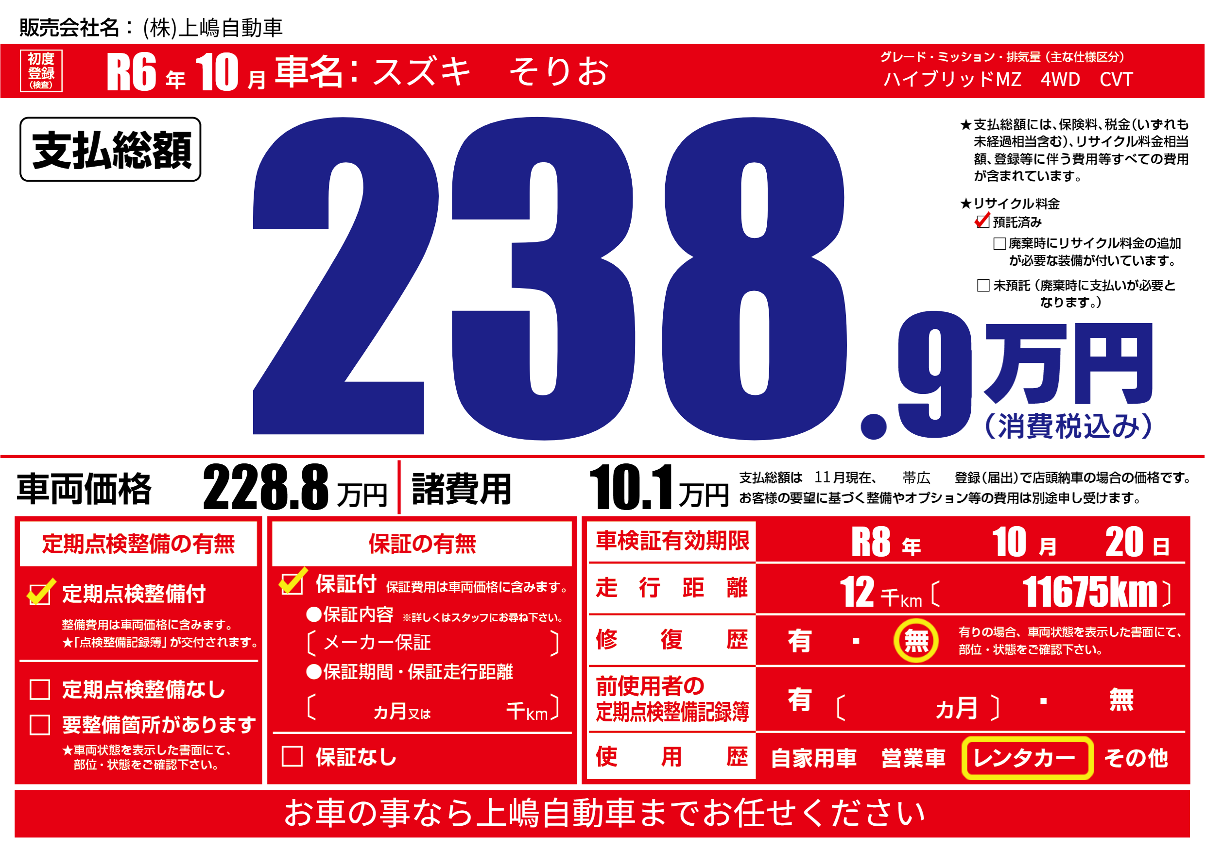 | 走行キロ | 1.2万km | 初年度登録 | R6年10月 |