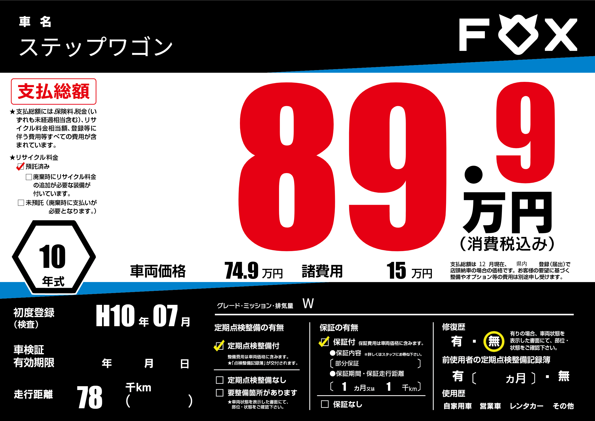| 走行キロ | 7.8万km | 初年度登録 | H10年07月 |