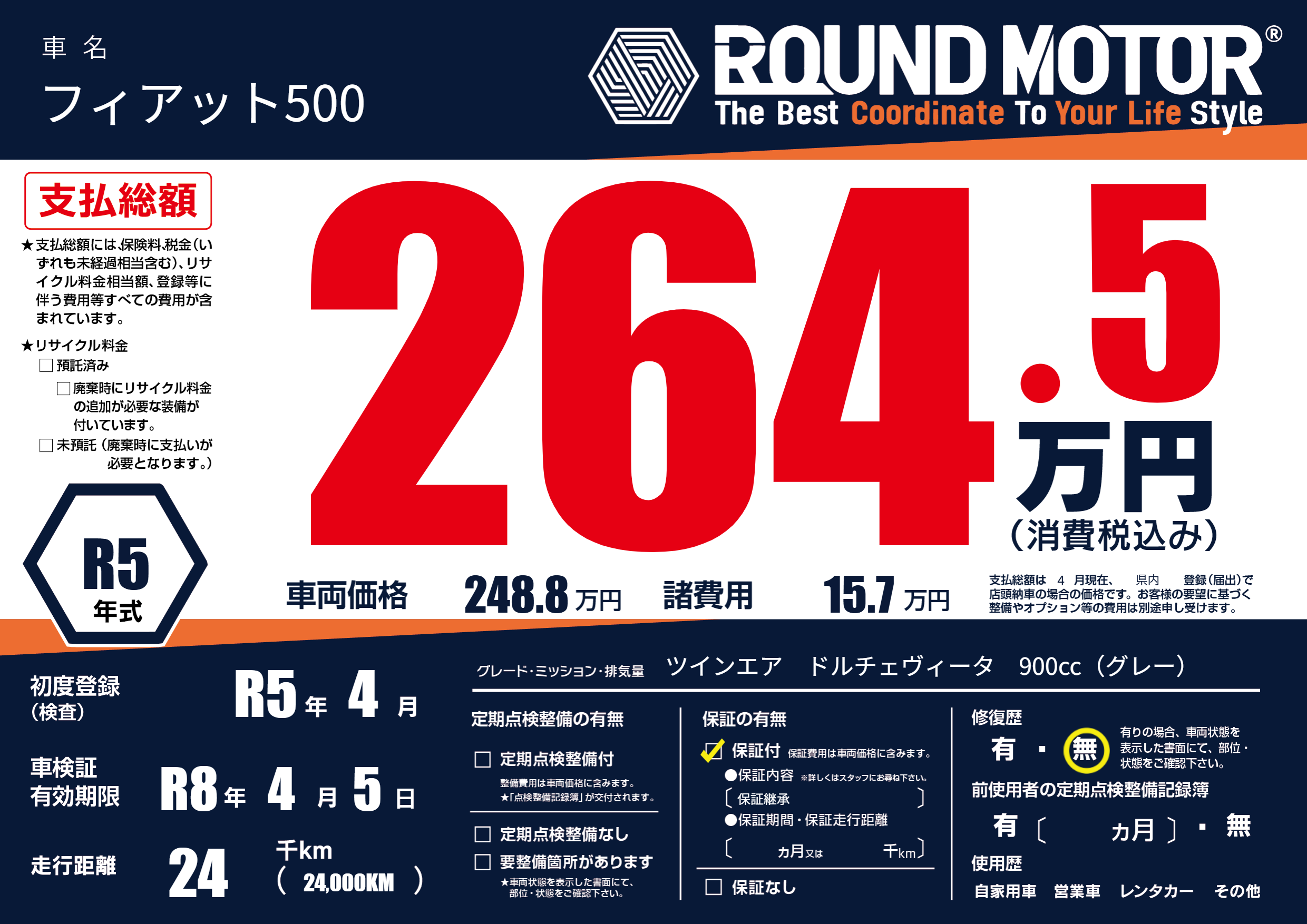 | 車名 | フィアット500 | グレード ミッション 排気量 |