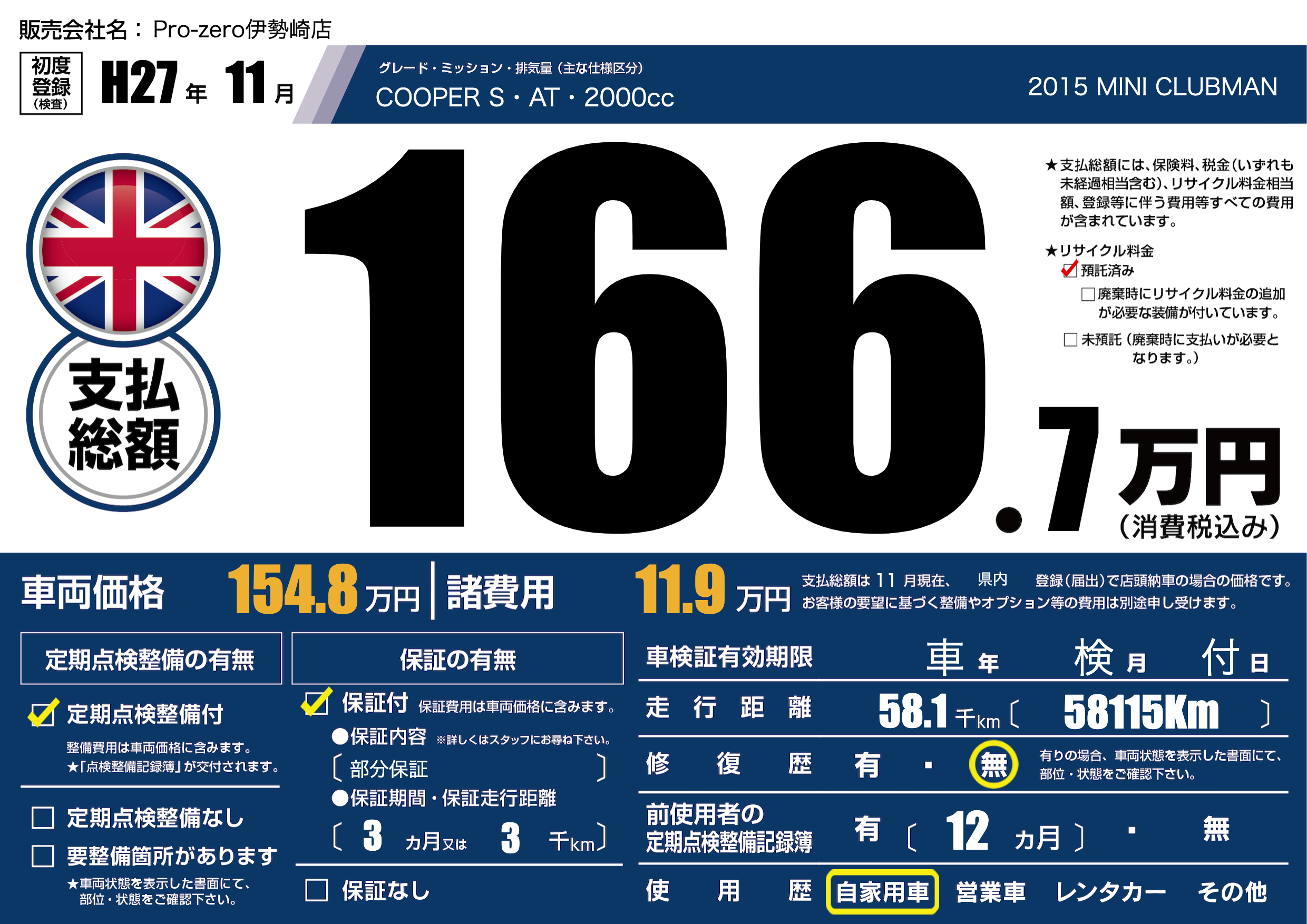| 車名 | 2015 MINI CLUBMAN | グレード ミッション 排気量 |