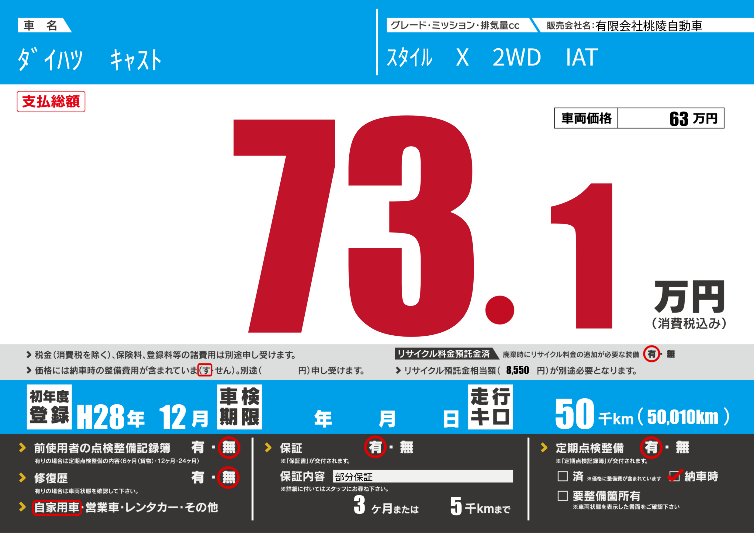 | 車名 | ダイハツ キャスト | グレード ミッション 排気量 |