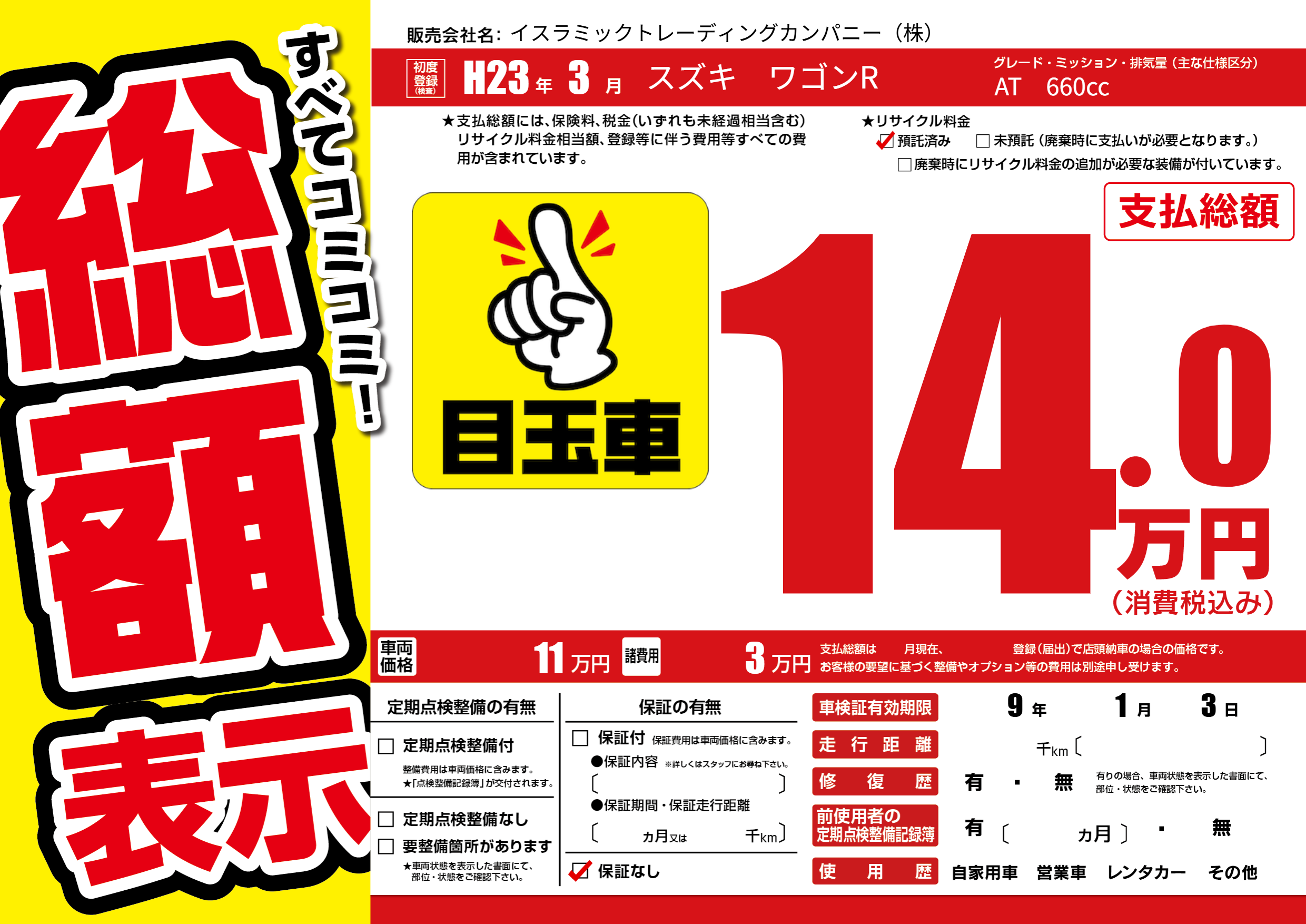 | 走行キロ | - | 初年度登録 | H23年3月 |