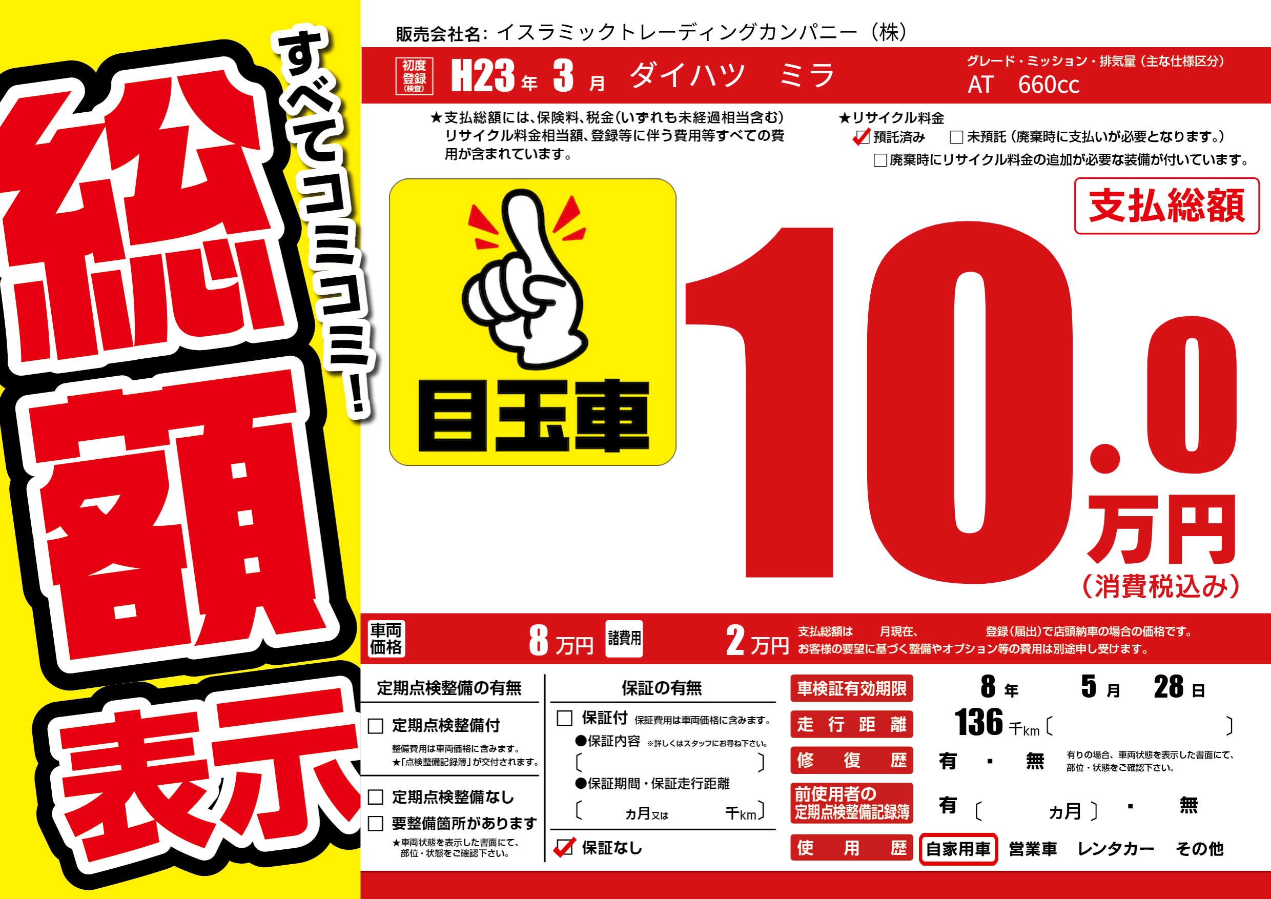 | 走行キロ | 13.6万km | 初年度登録 | H23年3月 |