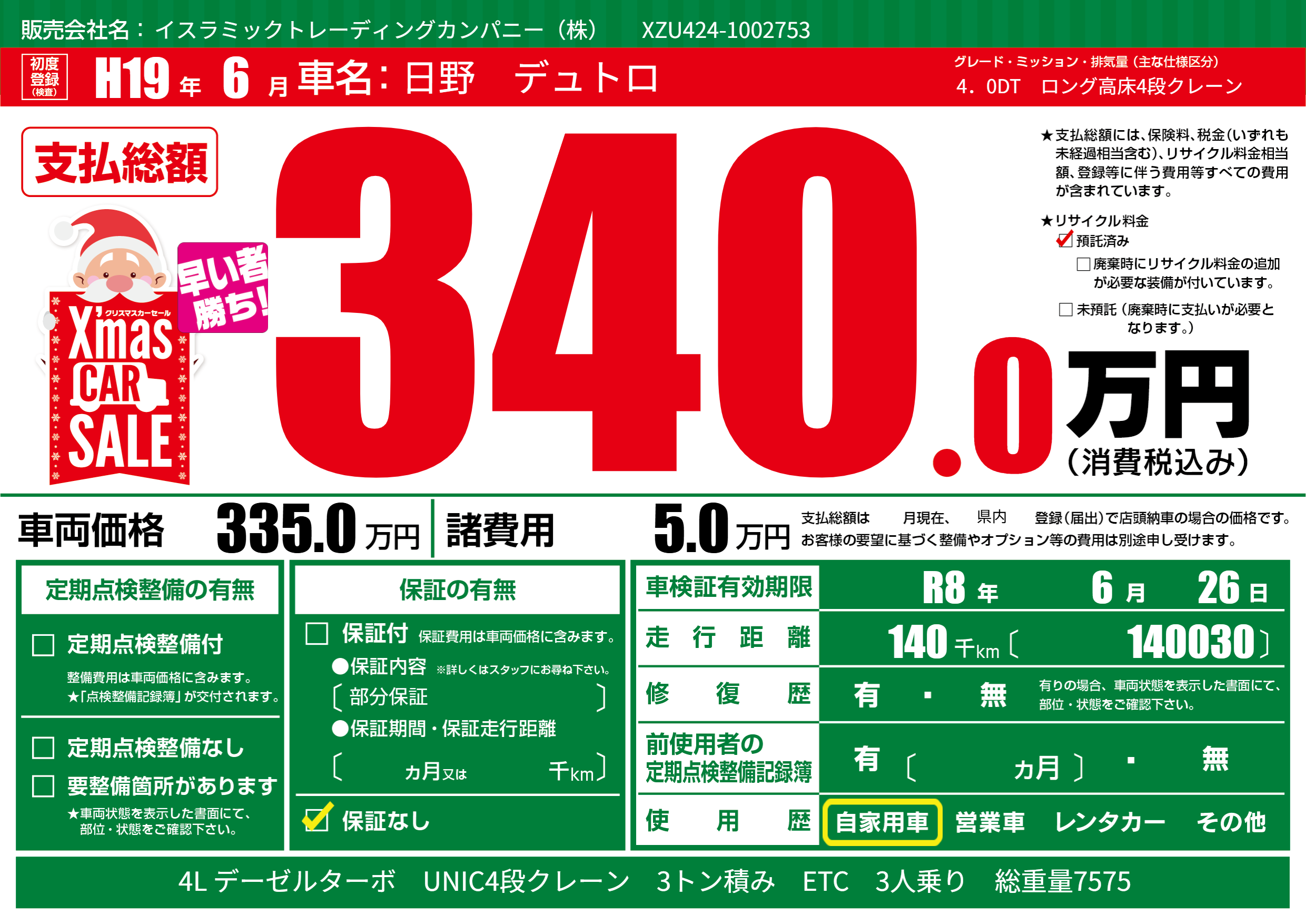 | 走行キロ | 14万km | 初年度登録 | H19年6月 |