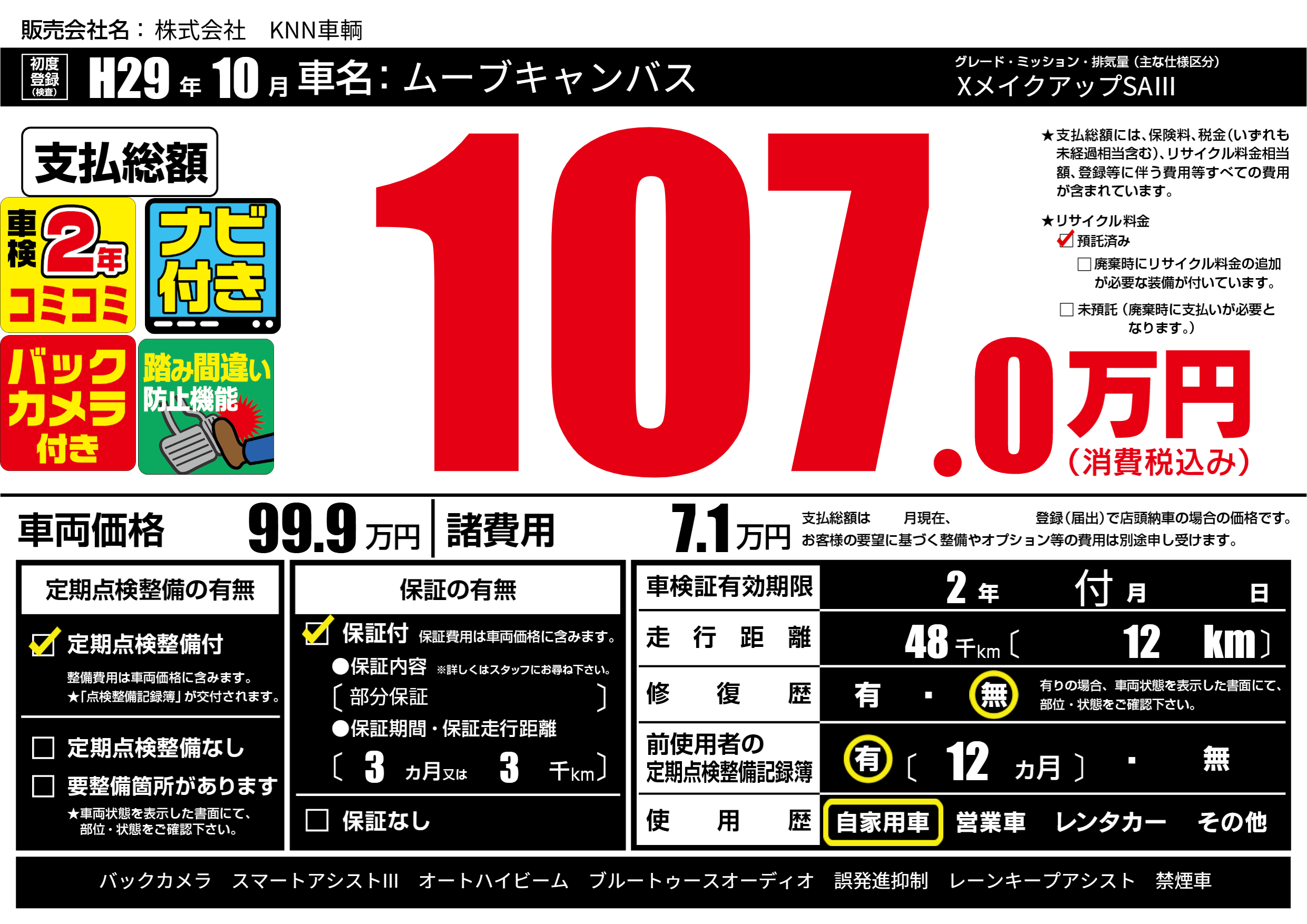 | 走行キロ | 4.8万km | 初年度登録 | H29年10月 |