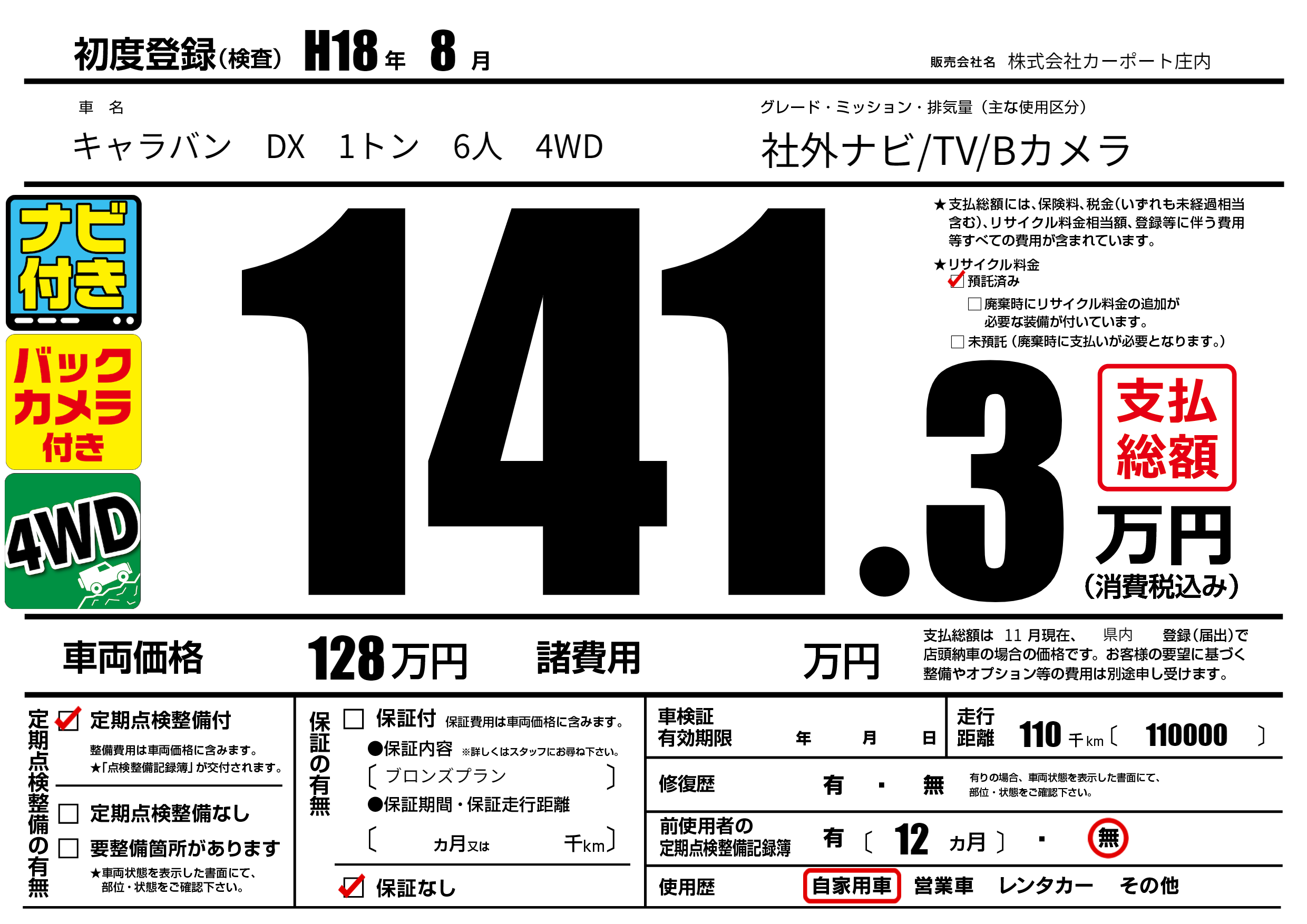 | 車名 | キャラバン DX 1トン 6人 4WD | グレード ミッション 排気量 |