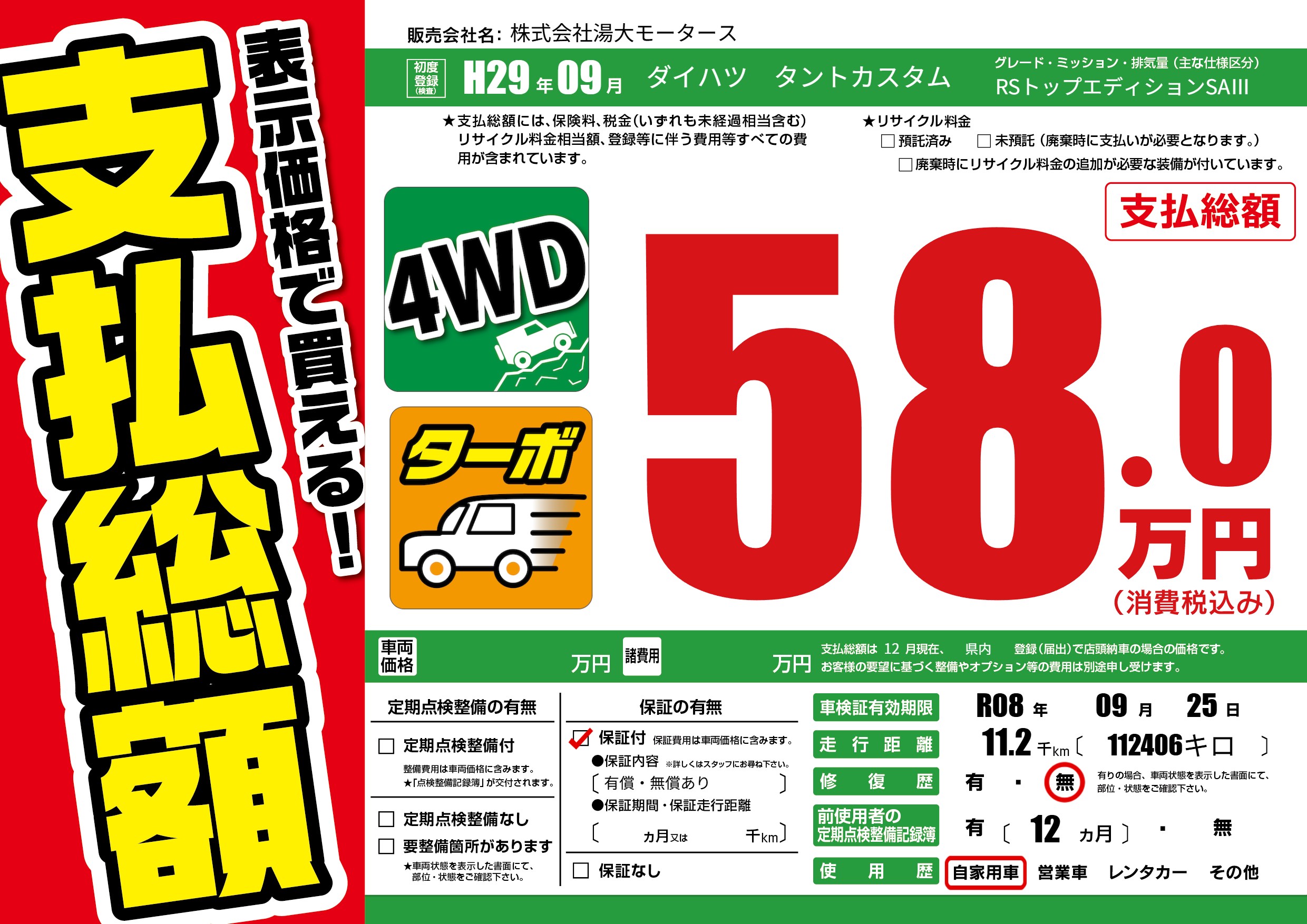 保証付き 保証内容(有償・無償あり) ---ヶ月または()千kmまで |