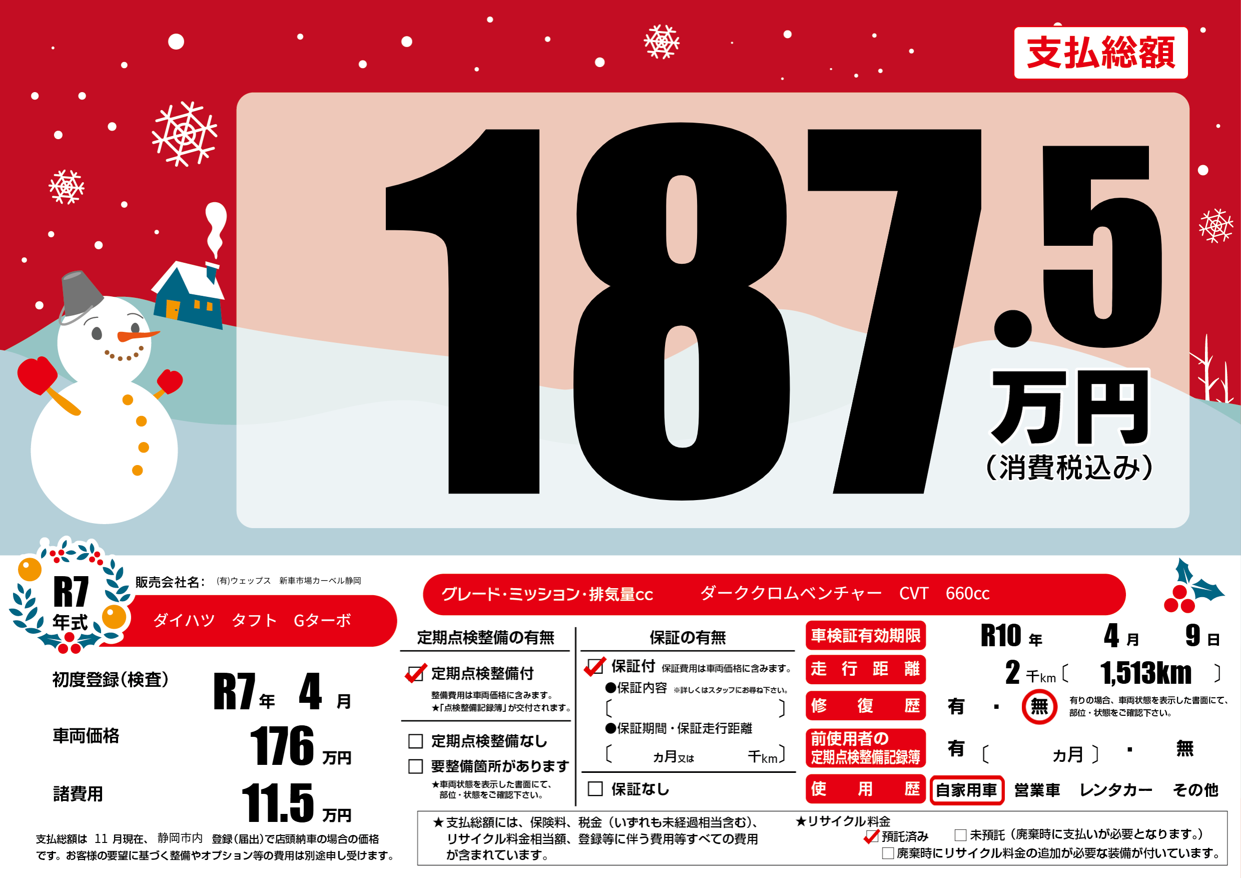 | 走行キロ | 0.2万km | 初年度登録 | R7年4月 |