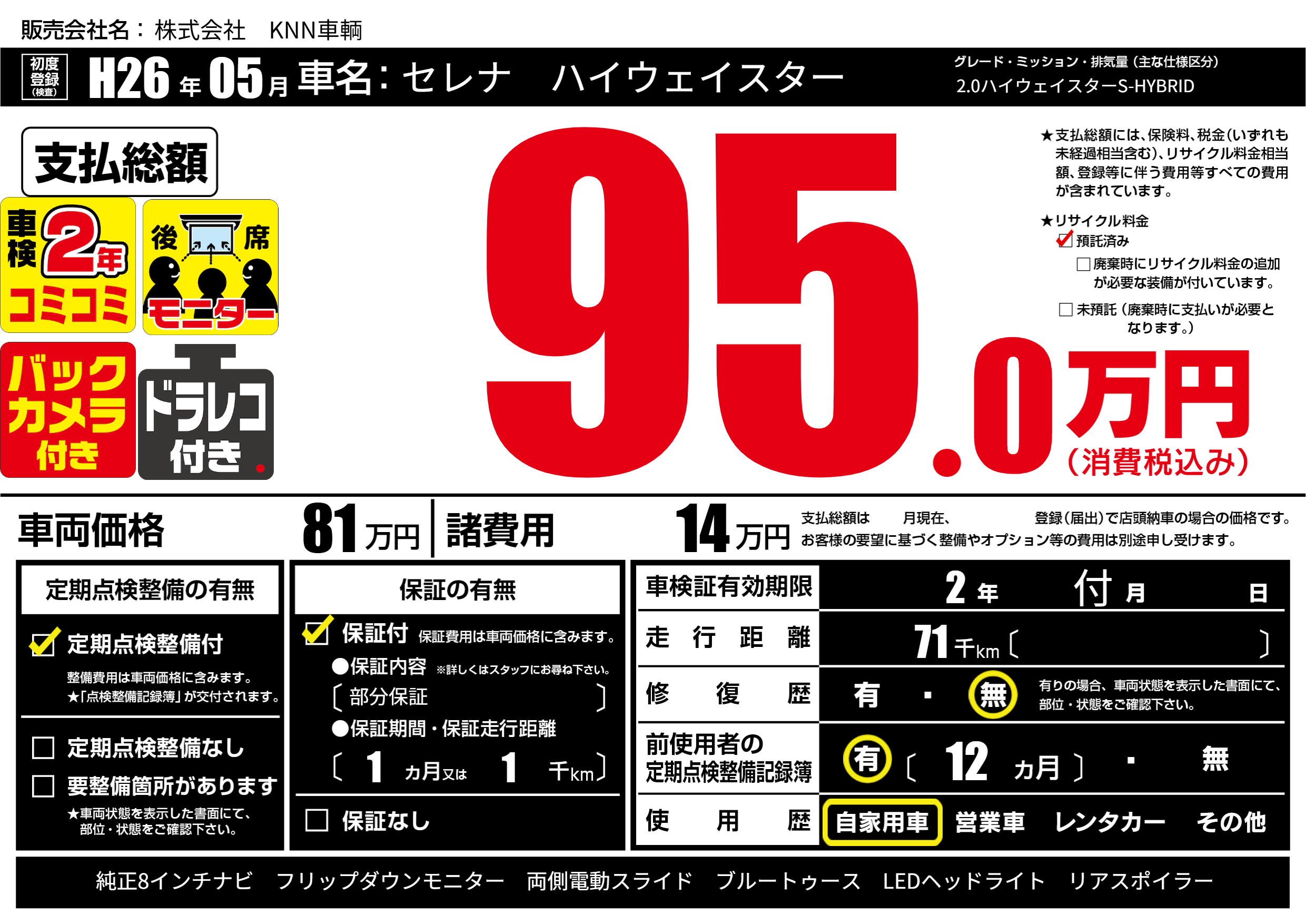 | 車名 | セレナ ハイウェイスター | グレード ミッション 排気量 |