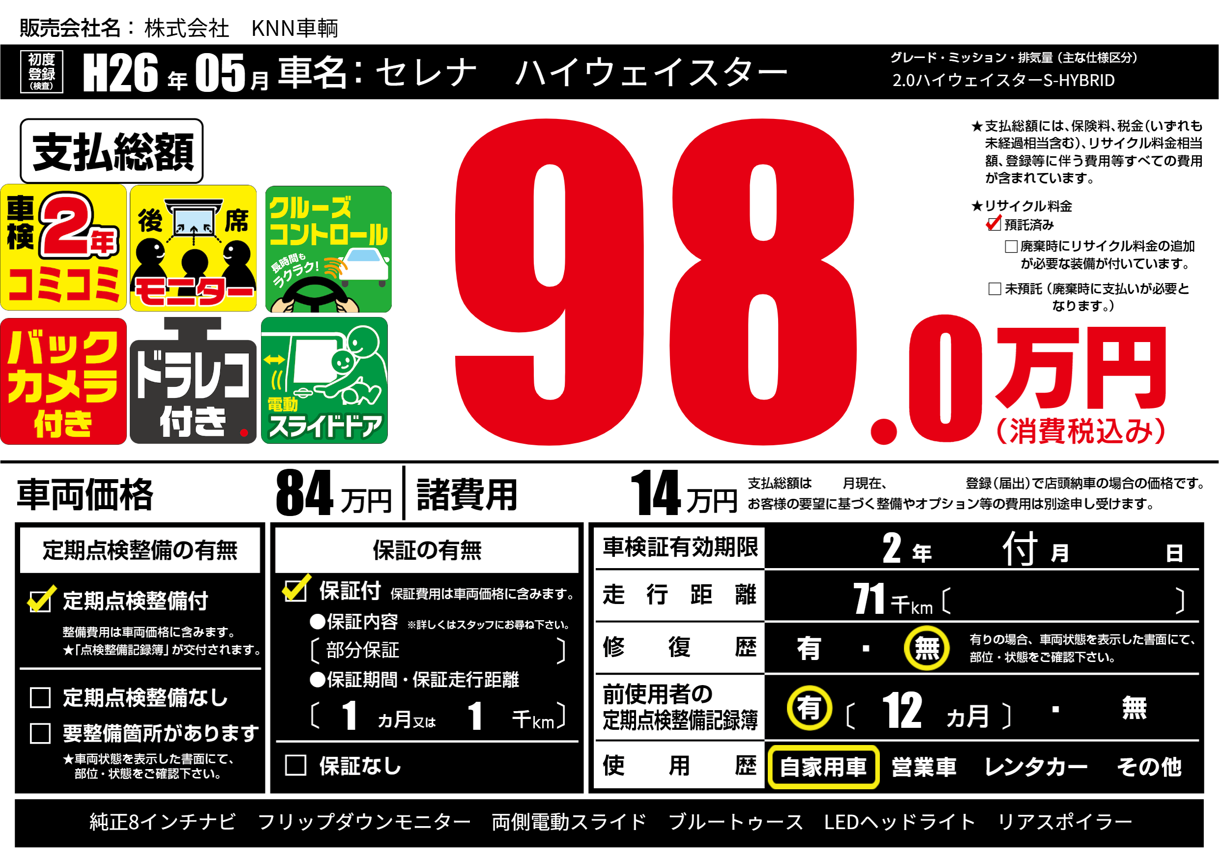 | 車名 | セレナ ハイウェイスター | グレード ミッション 排気量 |