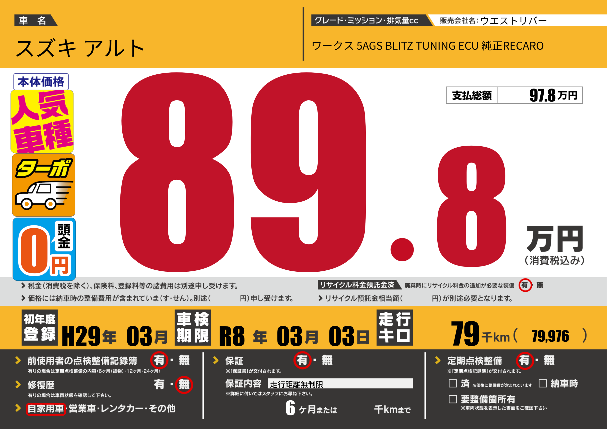 | 車名 | スズキ アルト | グレード ミッション 排気量 |
