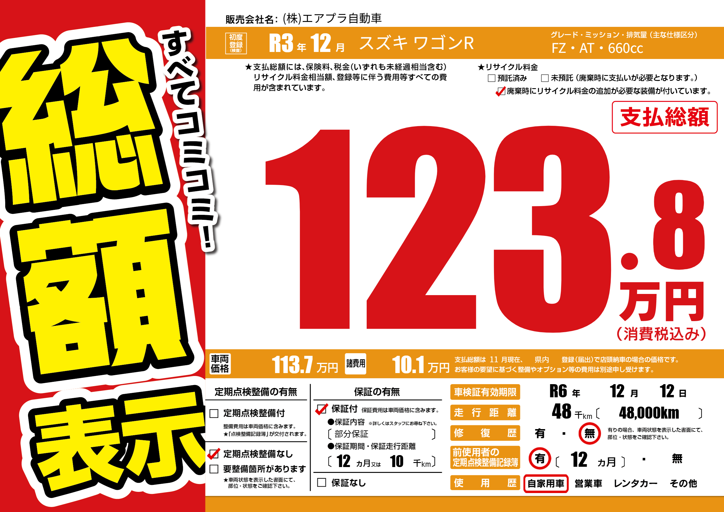 | 車名 | スズキ ワゴンR | グレード ミッション 排気量 |