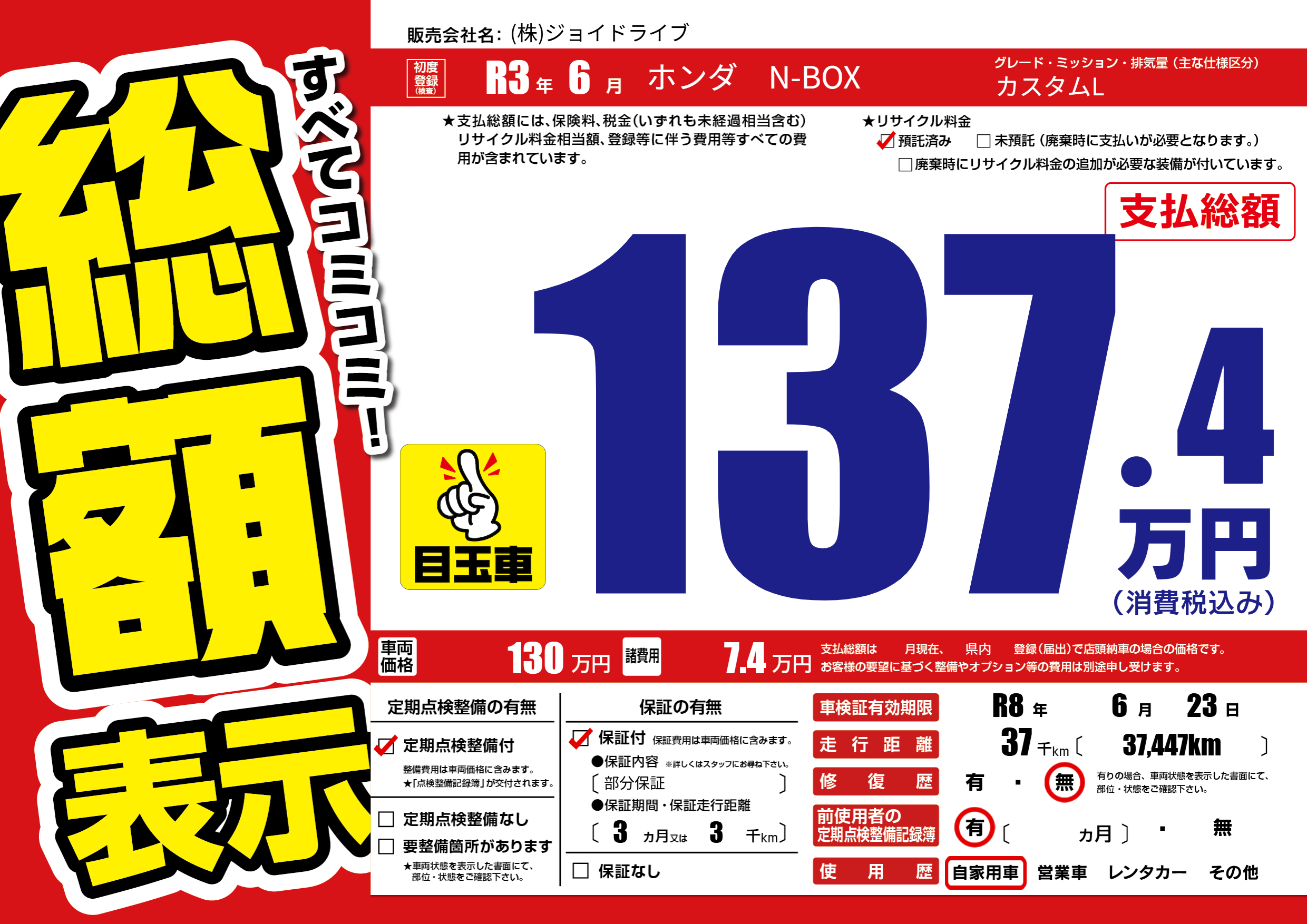 | 走行キロ | 3.7万km | 初年度登録 | R3年6月 |