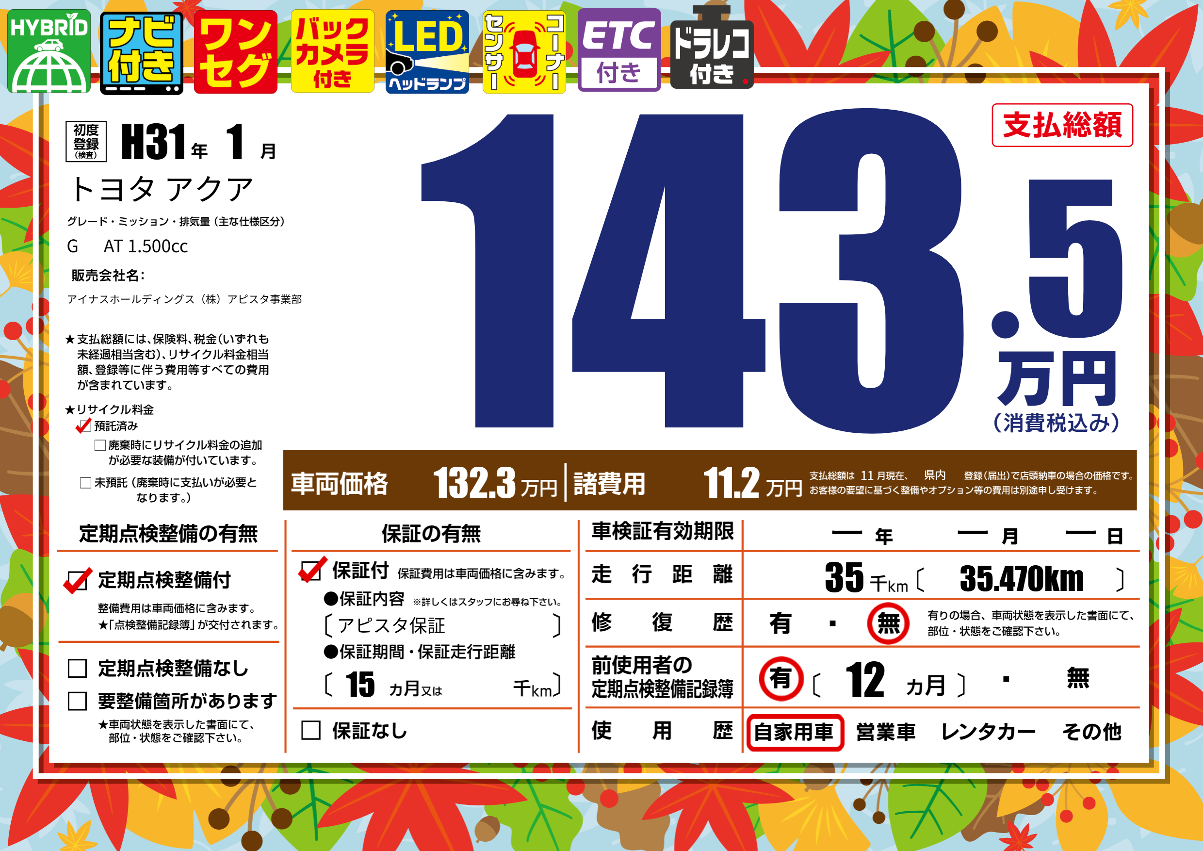| 車名 | トヨタ アクア | グレード ミッション 排気量 |