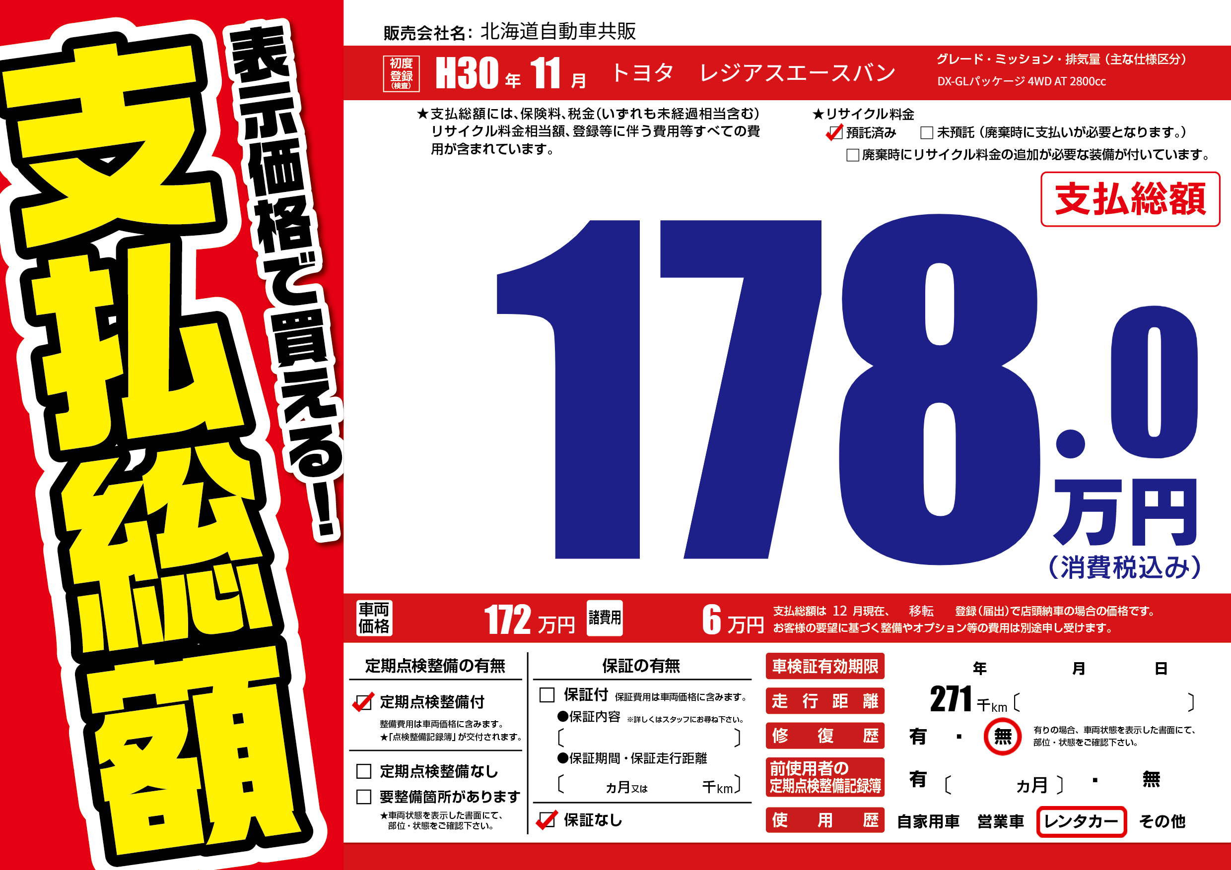 | 走行キロ | 27.1万km | 初年度登録 | H30年11月 |