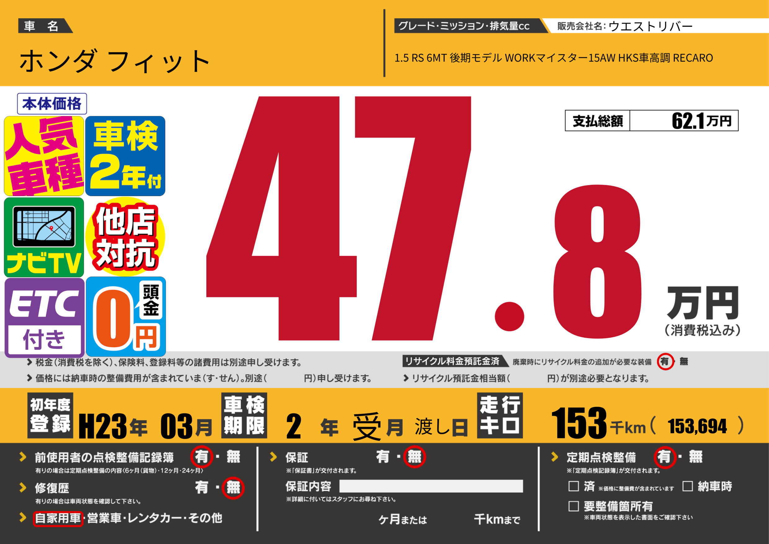 | 走行キロ | 15.3万km | 初年度登録 | H23年03月 |
