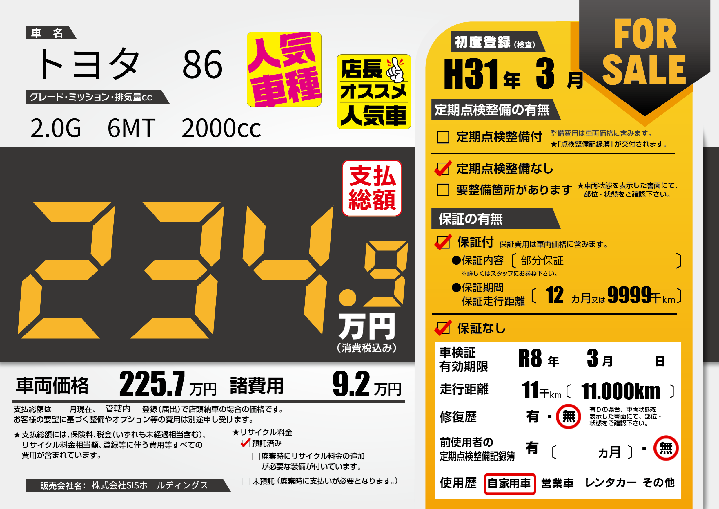 なし | 車検制限 | R8年3月---月 |