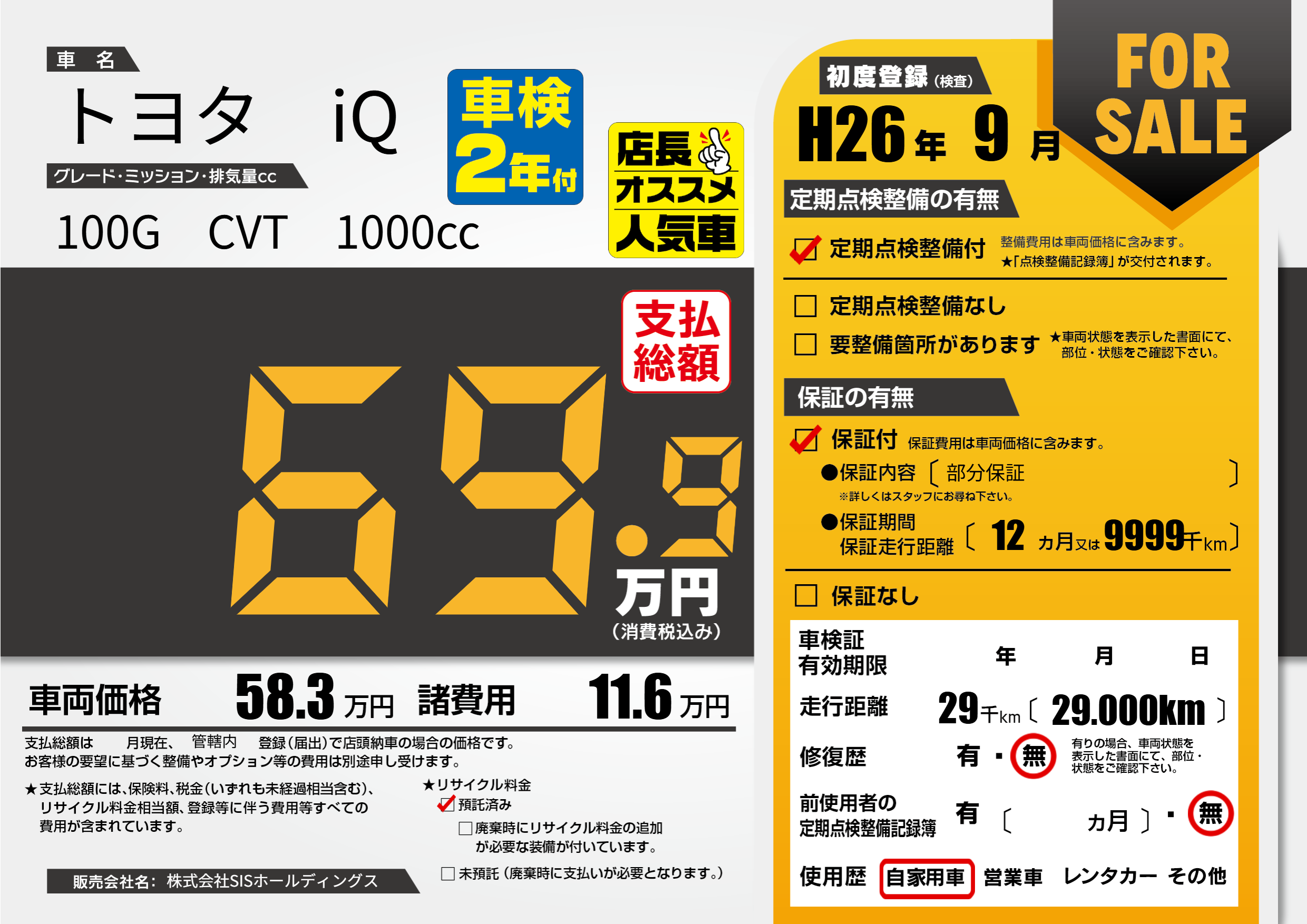 保証付き 保証内容(部分保証) 12ヶ月または(9999)千kmまで |