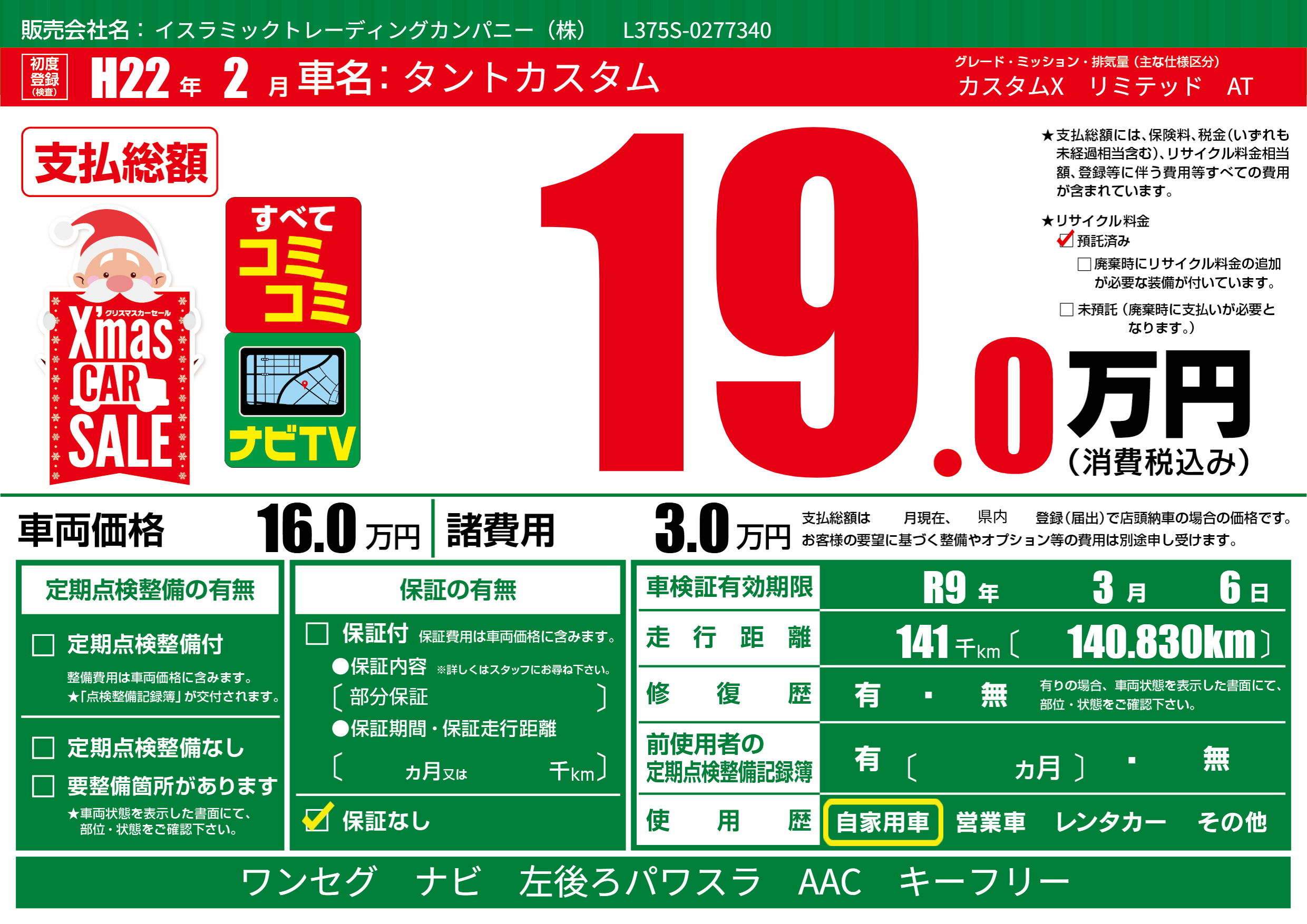 | 車名 | タントカスタム | グレード ミッション 排気量 |
