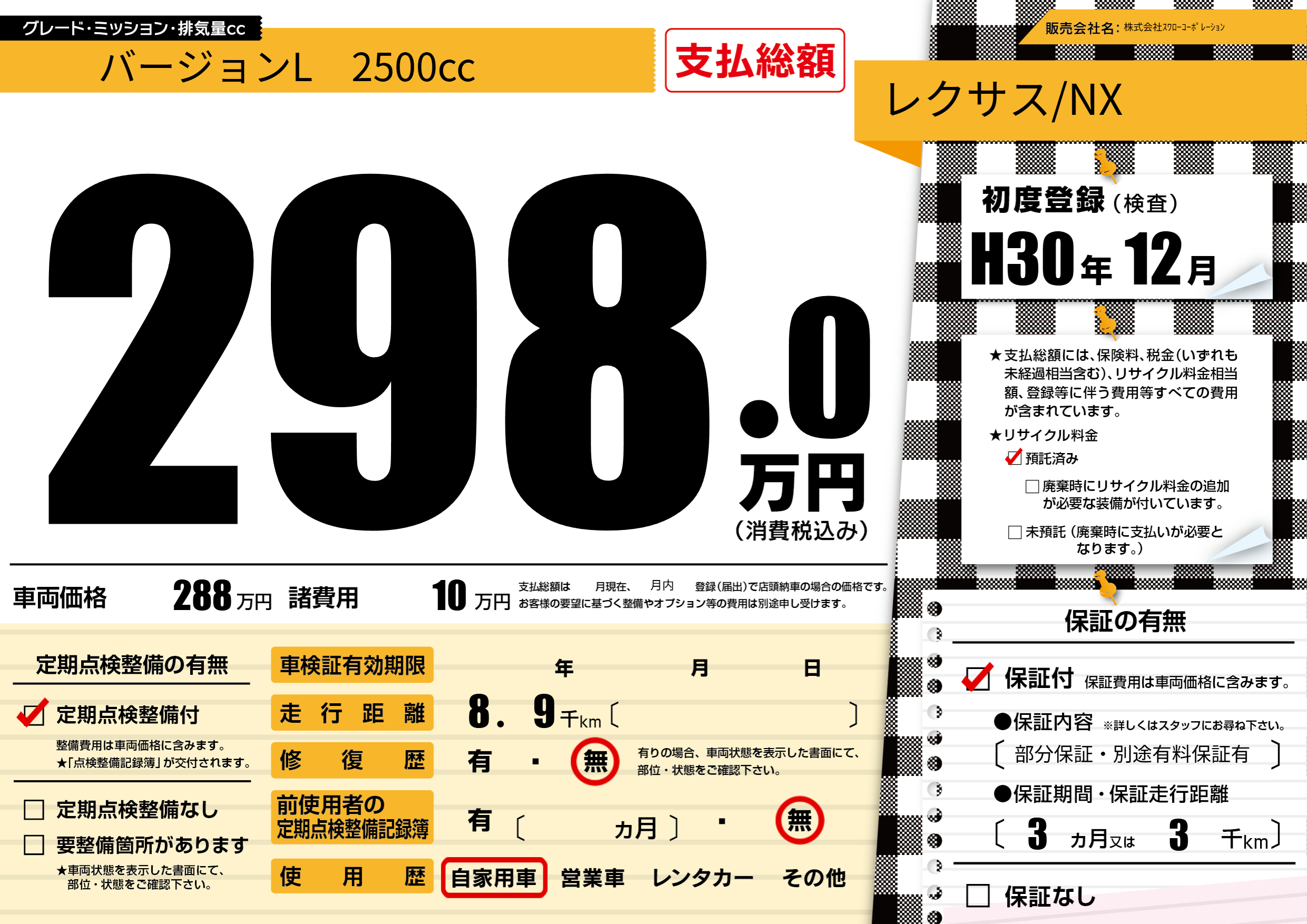 | 車名 | レクサス/NX | グレード ミッション 排気量 |