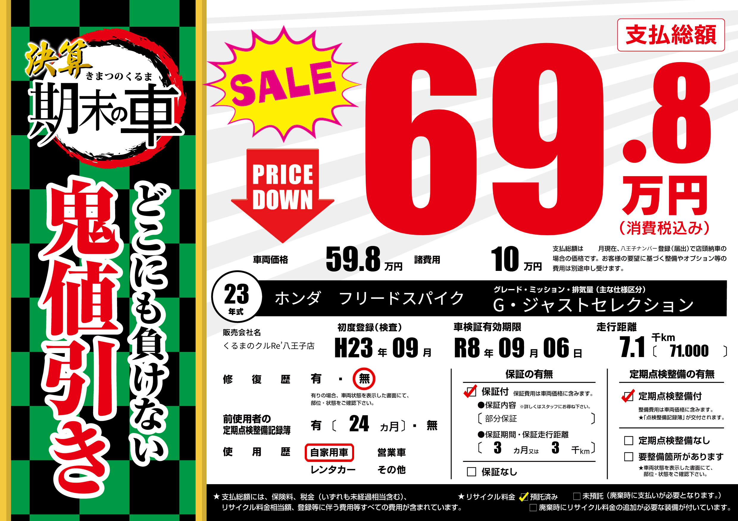 | 走行キロ | 0.7万km | 初年度登録 | H23年09月 |
