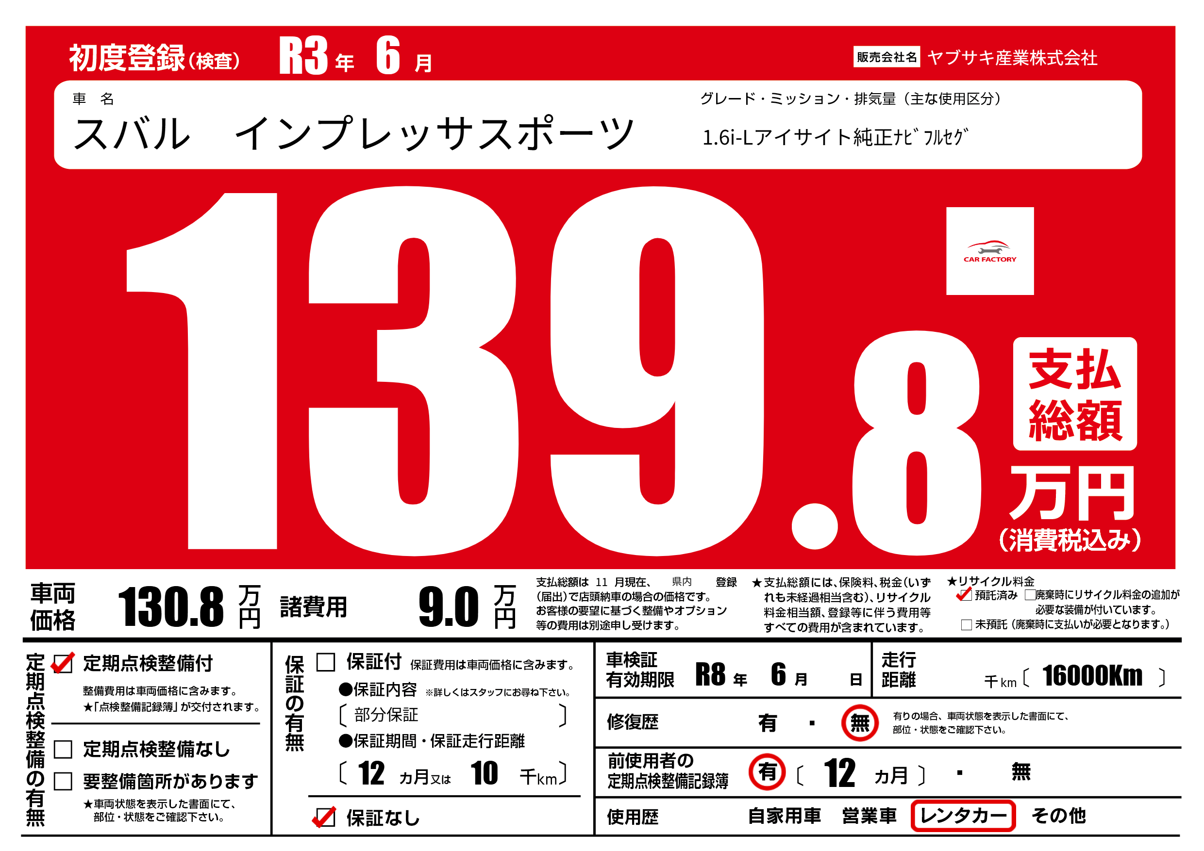 | 車名 | スバル インプレッサスポーツ | グレード ミッション 排気量 |