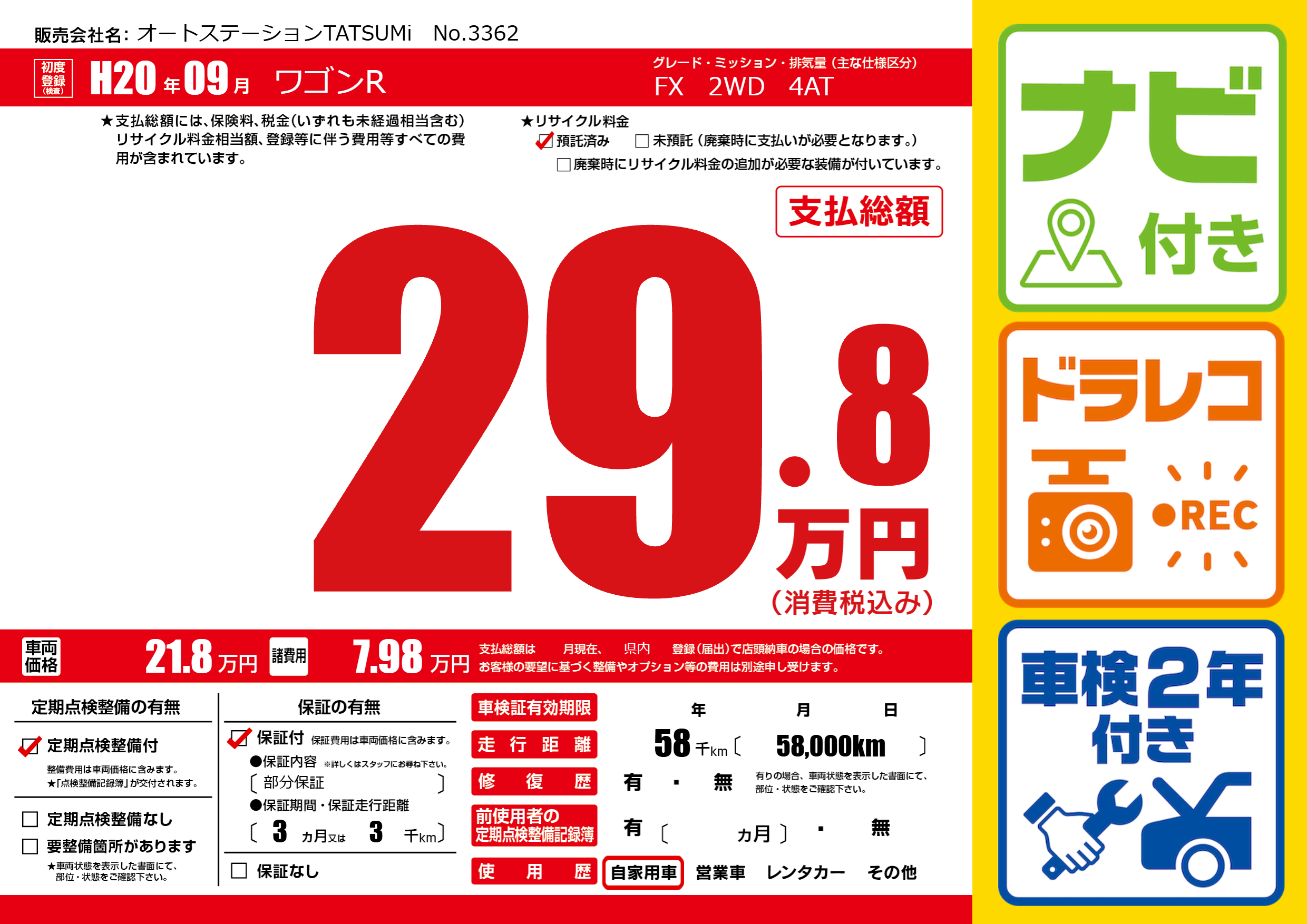 | 走行キロ | 5.8万km | 初年度登録 | H20年09月 |