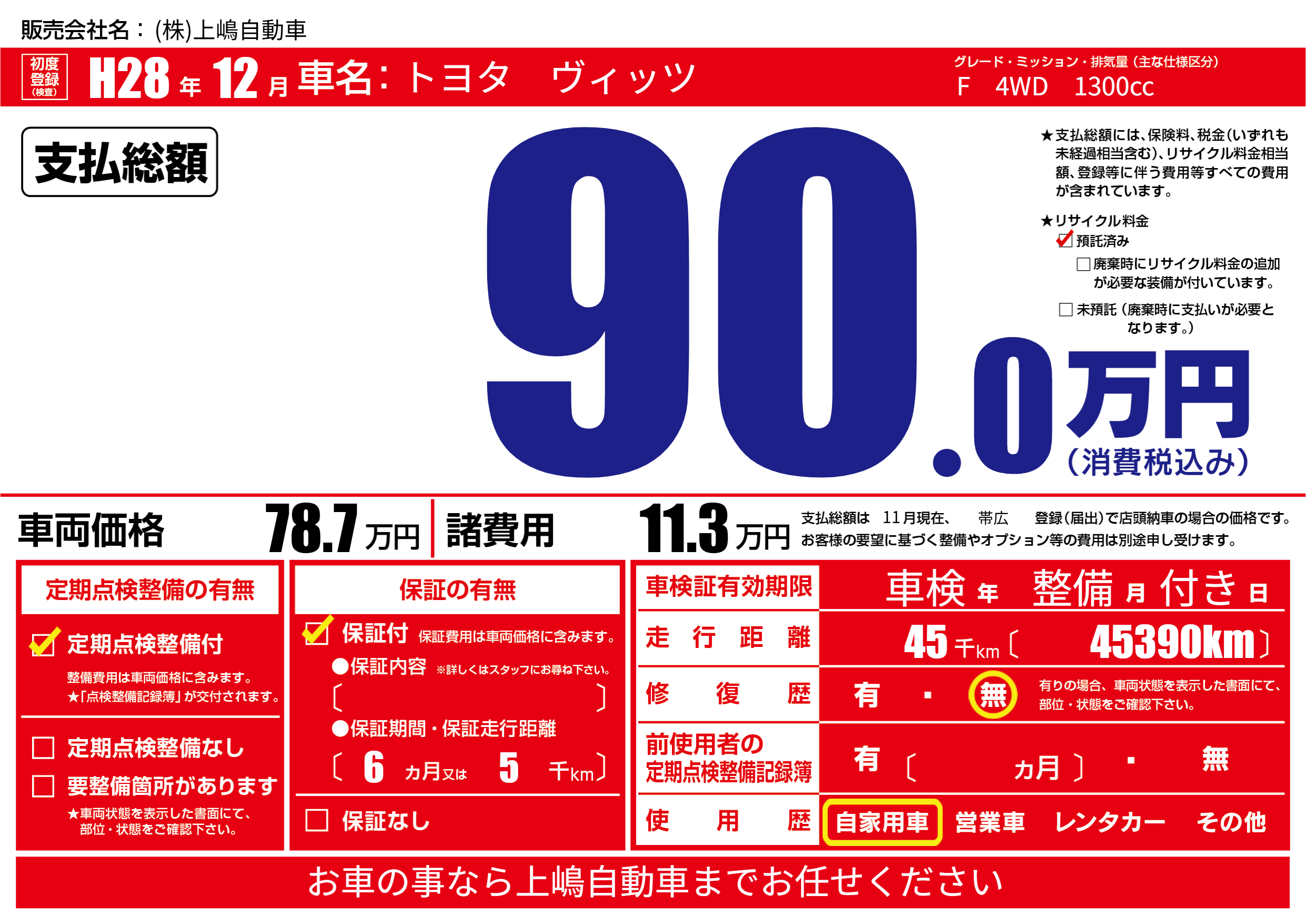 | 車名 | トヨタ ヴィッツ | グレード ミッション 排気量 |