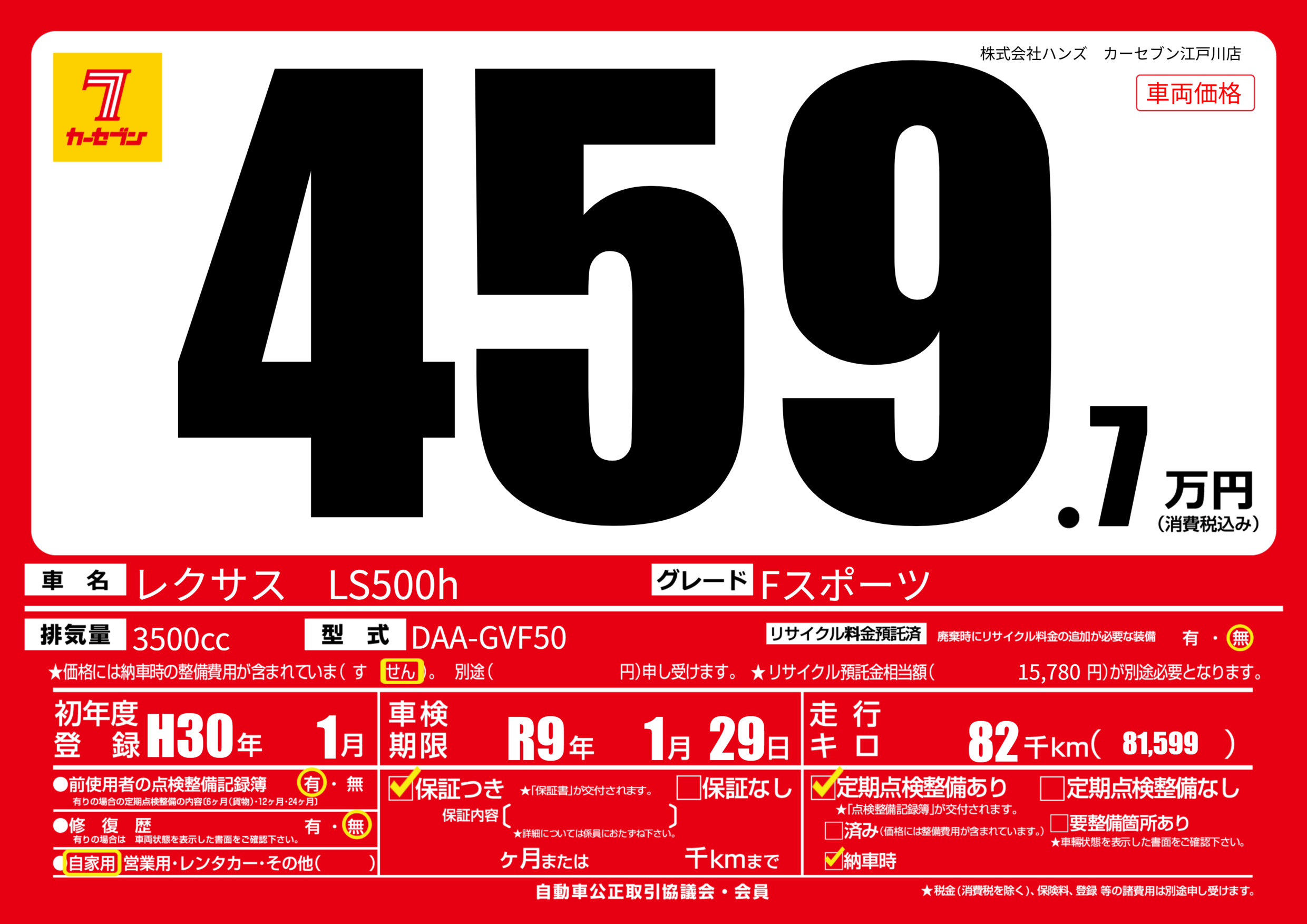 | 車名 | レクサス LS500h | グレード ミッション 排気量 |
