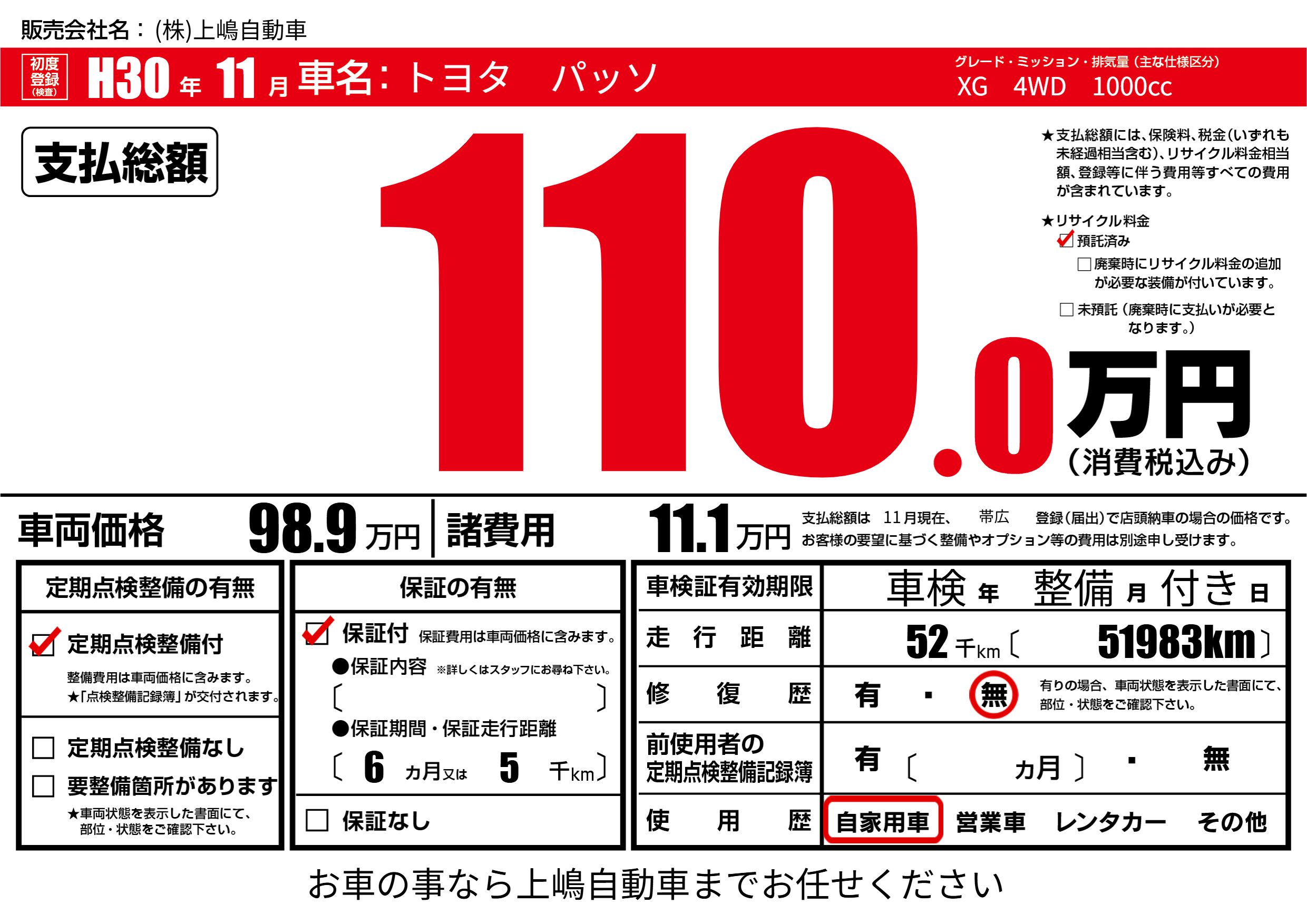| 車名 | トヨタ パッソ | グレード ミッション 排気量 |