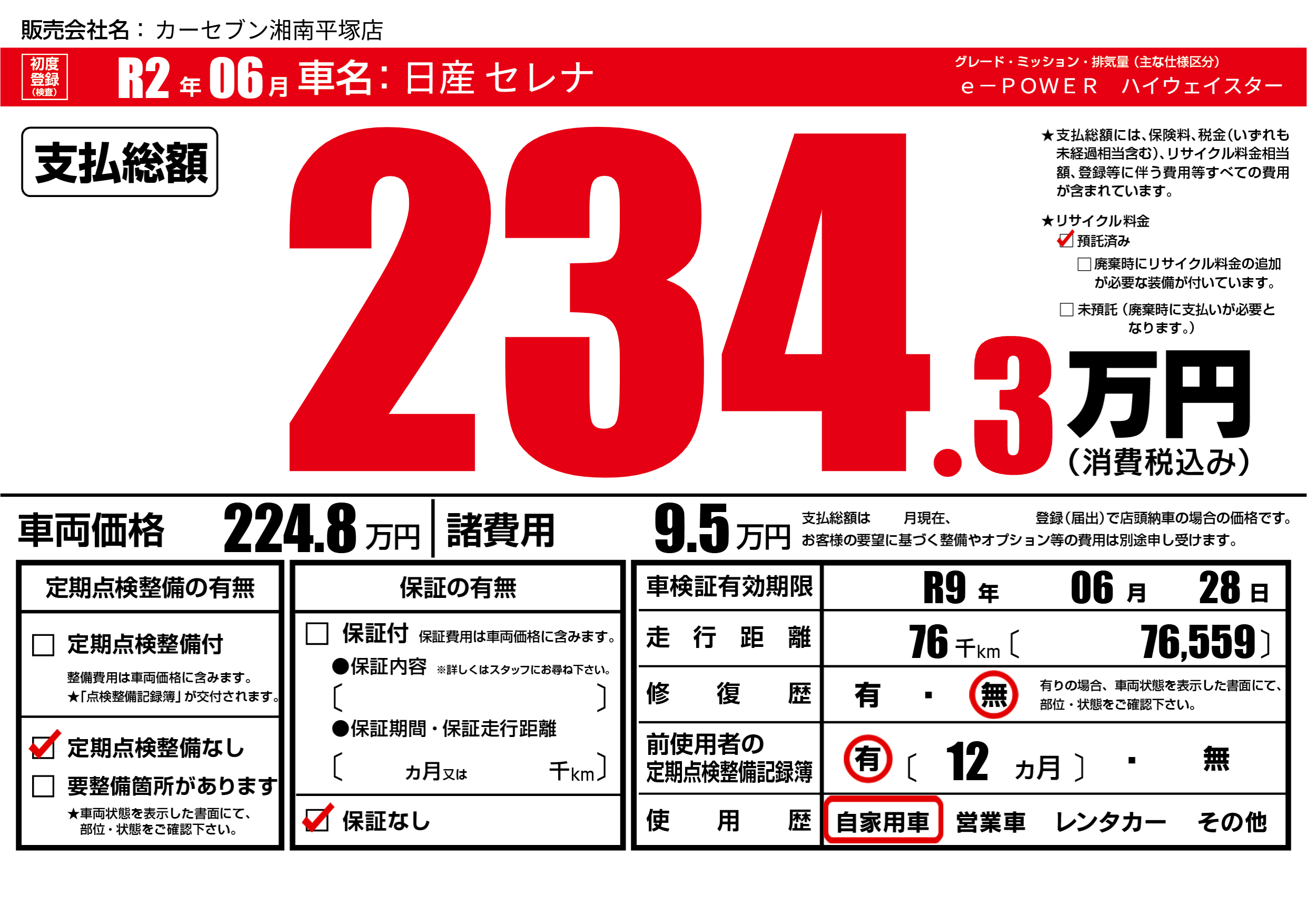 | 車名 | 日産 セレナ | グレード ミッション 排気量 |